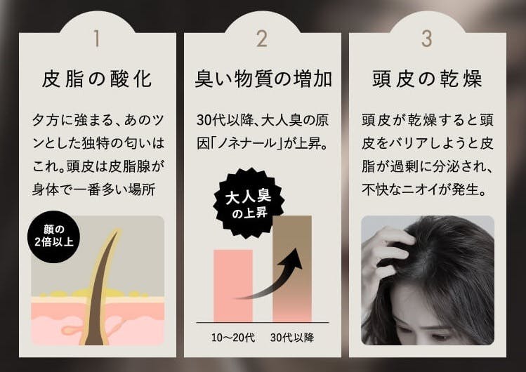 では、なぜ頭皮が臭くなるのか。原因は主に3つ。