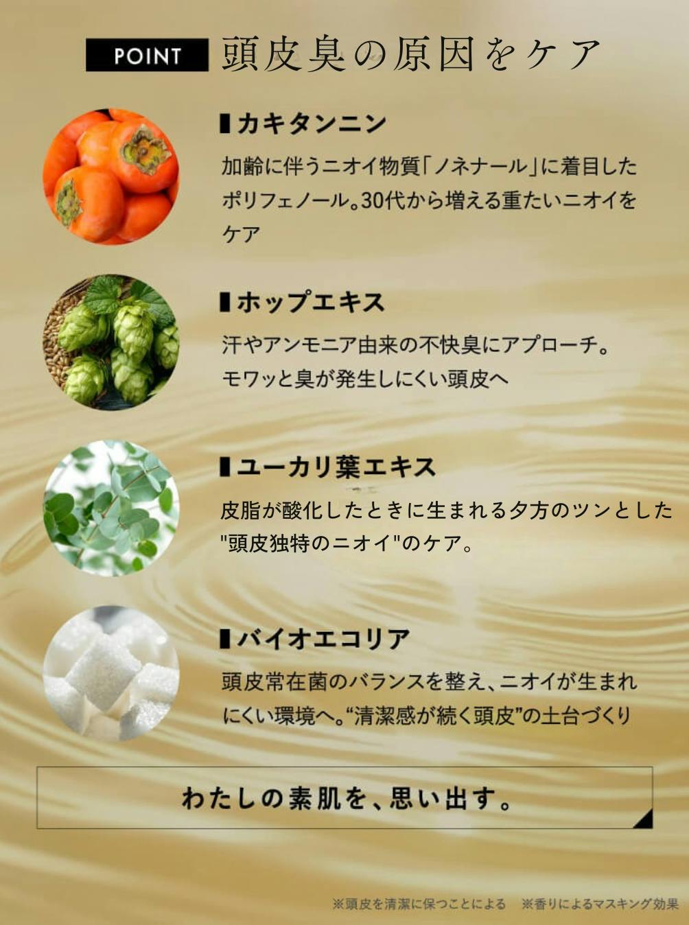 [配合成分] 水、イソペンチルジオール、PEG-40水添ヒマシ油、香料、ホップエキス、ユーカリ葉エキス、カキタンニン、グルカンオリゴサッカリド、ツバキ葉エキス、ヒアルロン酸Na、ユズ果実エキス、チャ葉エキス、ツボクサエキス、カンゾウ根エキス、カミツレ花エキス、イタドリ根エキス、ローズマリー葉エキス、オウゴン根エキス、ビンセトキシクムアトラツム根エキス、グリチルリチン酸2K、エゴマ葉エキス、イノシトール、オリーブ葉エキス、マツリカ葉細胞エキス、トウキンセンカ花エキス、パンテノール、加水分解ウールキューティクルタンパク、加水分解コンキオリンタンパク、加水分解シルク、ヒドロキシプロピルシクロデキストリン、1,2-ヘキサンジオール、BG、PEG-16マカデミアグリセリズ、クエン酸、クエン酸Na、グリシン、グリセリン、ペンチレングリコール、ポリクオタニウム-22、硫酸亜鉛、フェノキシエタノール