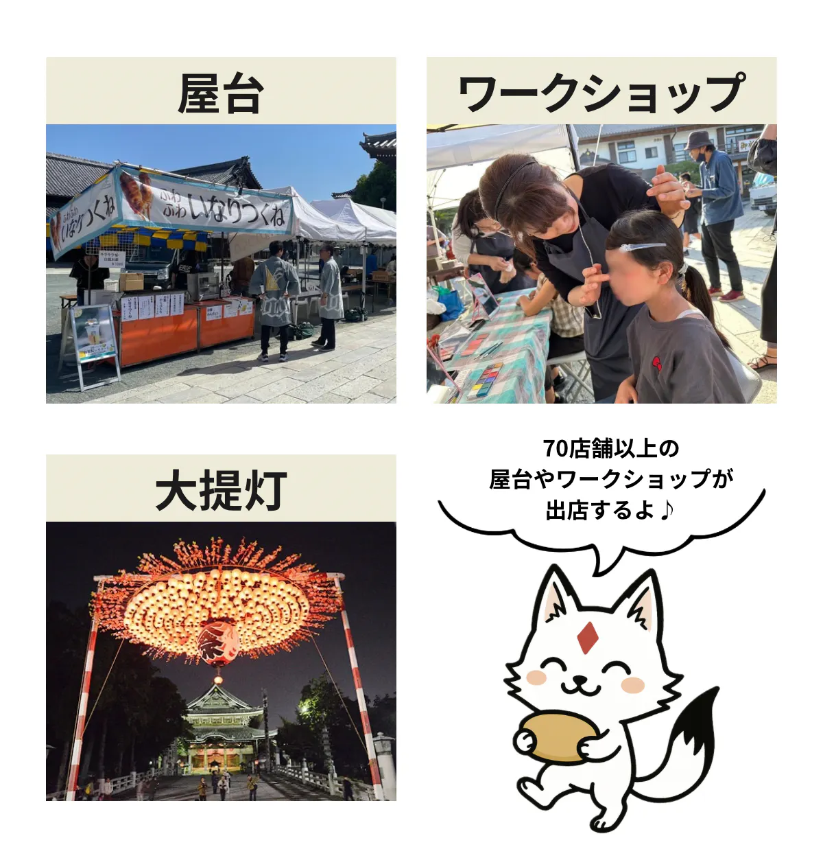 「白狐祭」は、かつて豊川稲荷で開催されていた夜間参拝イベント「ヨルモウデ」の文化を引き継ぎながら、ライトアップ・夜店・ステージ・アート・謎解きなどを融合した“進化する地域の夜祭り”です。