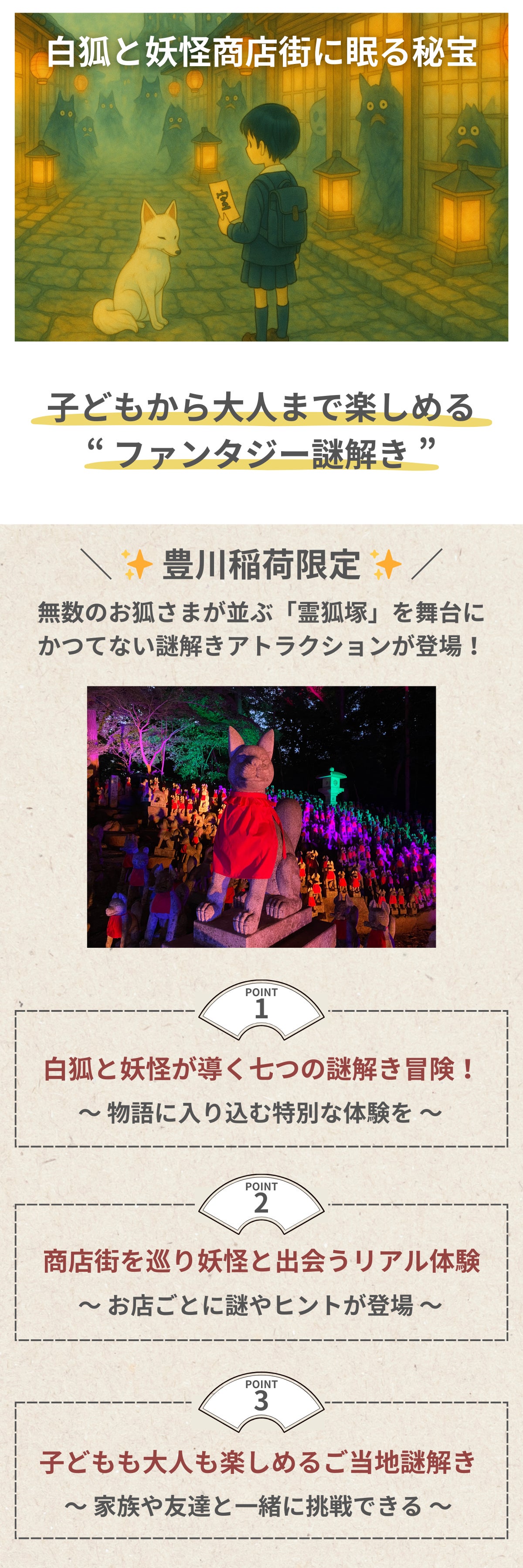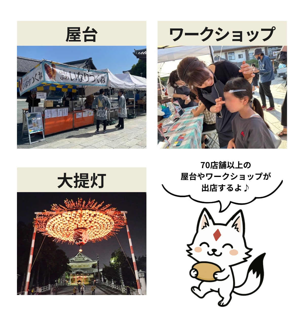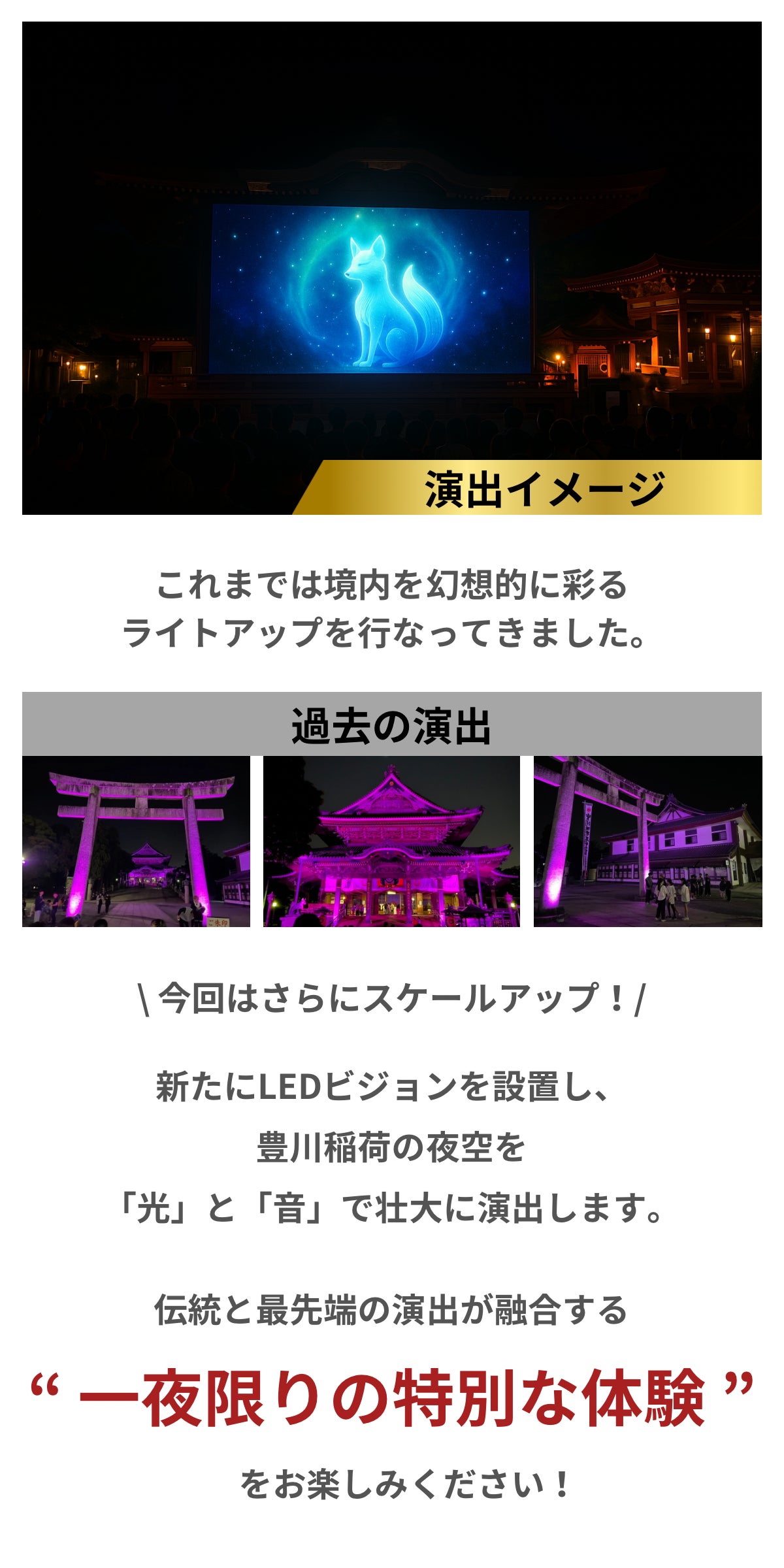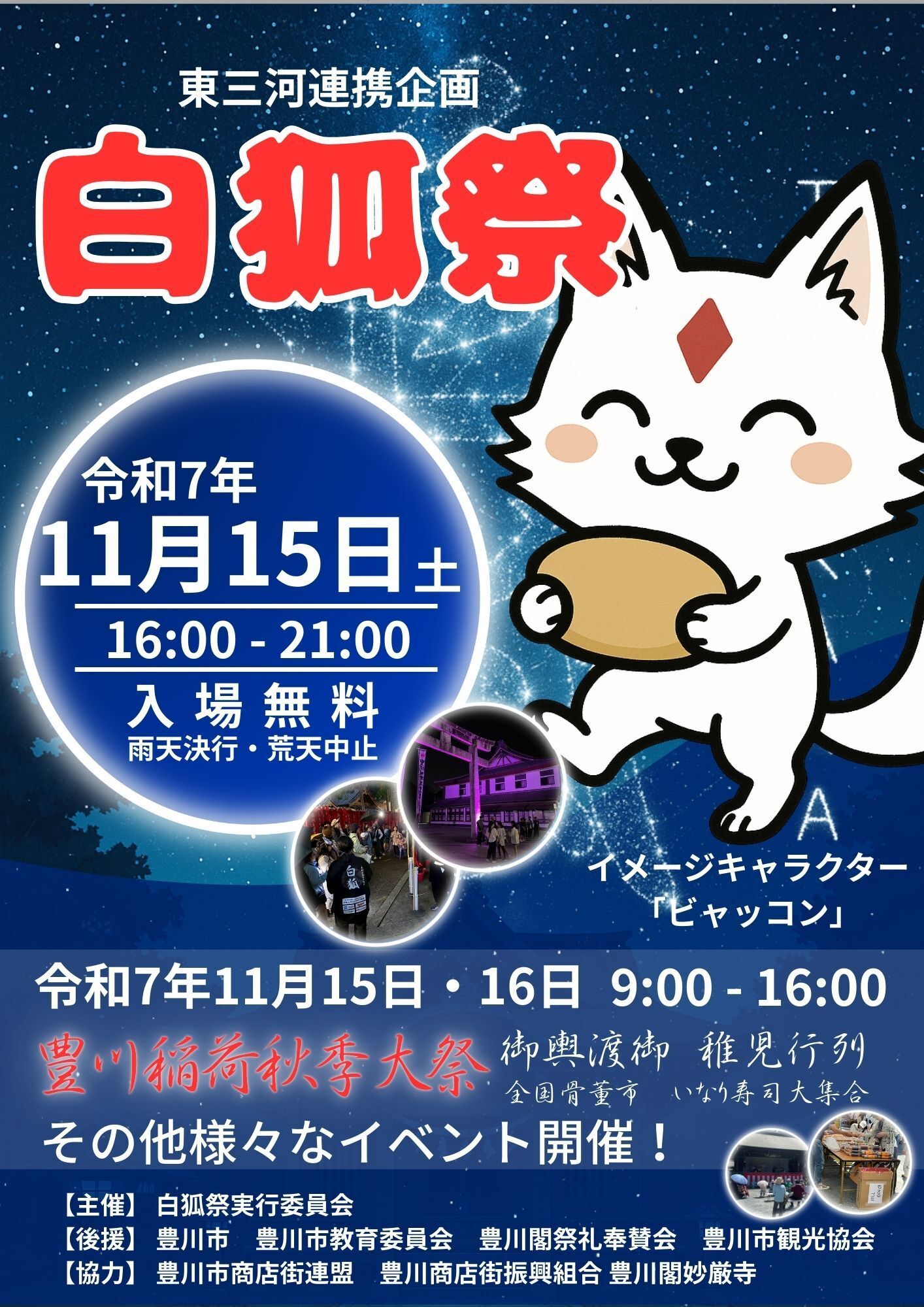 「白狐祭」は、かつて豊川稲荷で開催されていた夜間参拝イベント「ヨルモウデ」の文化を引き継ぎながら、ライトアップ・夜店・ステージ・アート・謎解きなどを融合した“進化する地域の夜祭り”です。