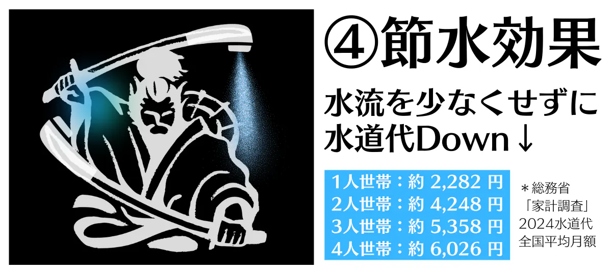 最大約80%の節水率、4人家族が毎日1日10分間使用した場合、年間で約24,000円の節水効果が見込めます。