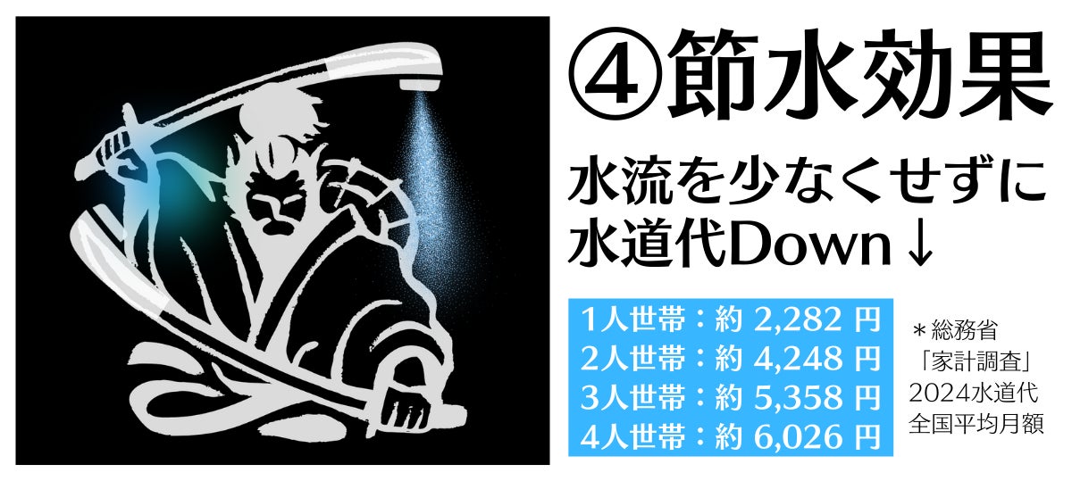 最大約80%の節水率、4人家族が毎日1日10分間使用した場合、年間で約24,000円の節水効果が見込めます。