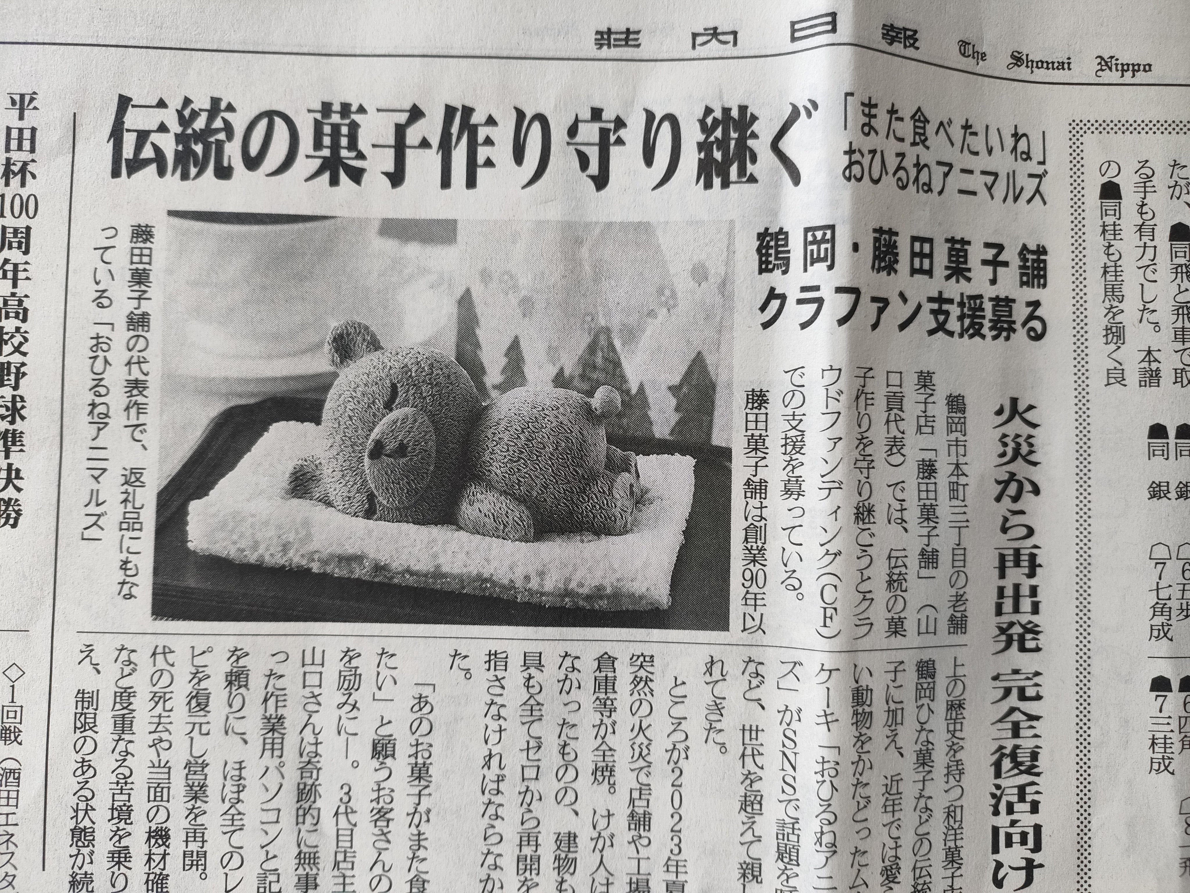 2026/04/17 06:39おはようございますご支援感謝申し上げます。本日地元紙、荘内日報様に藤田菓子舗クラウドファンディングの記事を掲載いただきました。地元の皆様のご支援感謝申し上げます。また全国からのあたたかい励ましのお言葉感謝いたします。引続き最終日まで頑張ってまいりますので、ご支援、ご協力お願い申し上げます。 もっと見る
