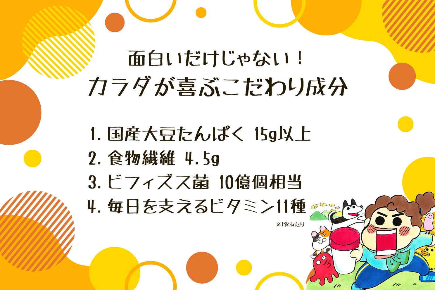 「貯筋」の土台となる国産大豆たんぱく(1食15g以上)に加え、カラダに嬉しい食物繊維(4.5g)とビフィズス菌(1食10億個相当)、そして毎日の元気を支える11種類のビタミンをぎゅっと凝縮。