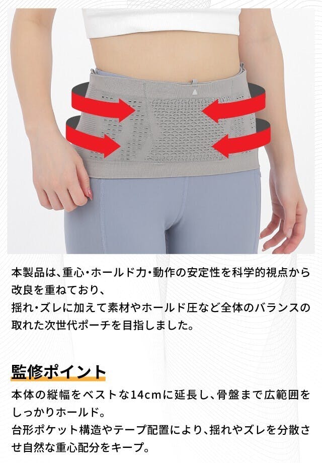 ランニングやウォーキング中の身体の動き・荷重のかかり方を徹底的に検証し、揺れにくさ・ズレにくさ・快適なフィット感を科学的に追求。縦幅の見直しや、下部へのシリコン滑り止めテープの追加など、プロの知見が反映された構造により、長時間の使用でも自然な装着感と高い安定性を実現しました。