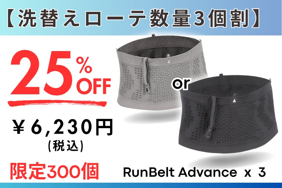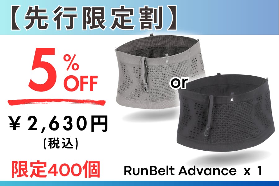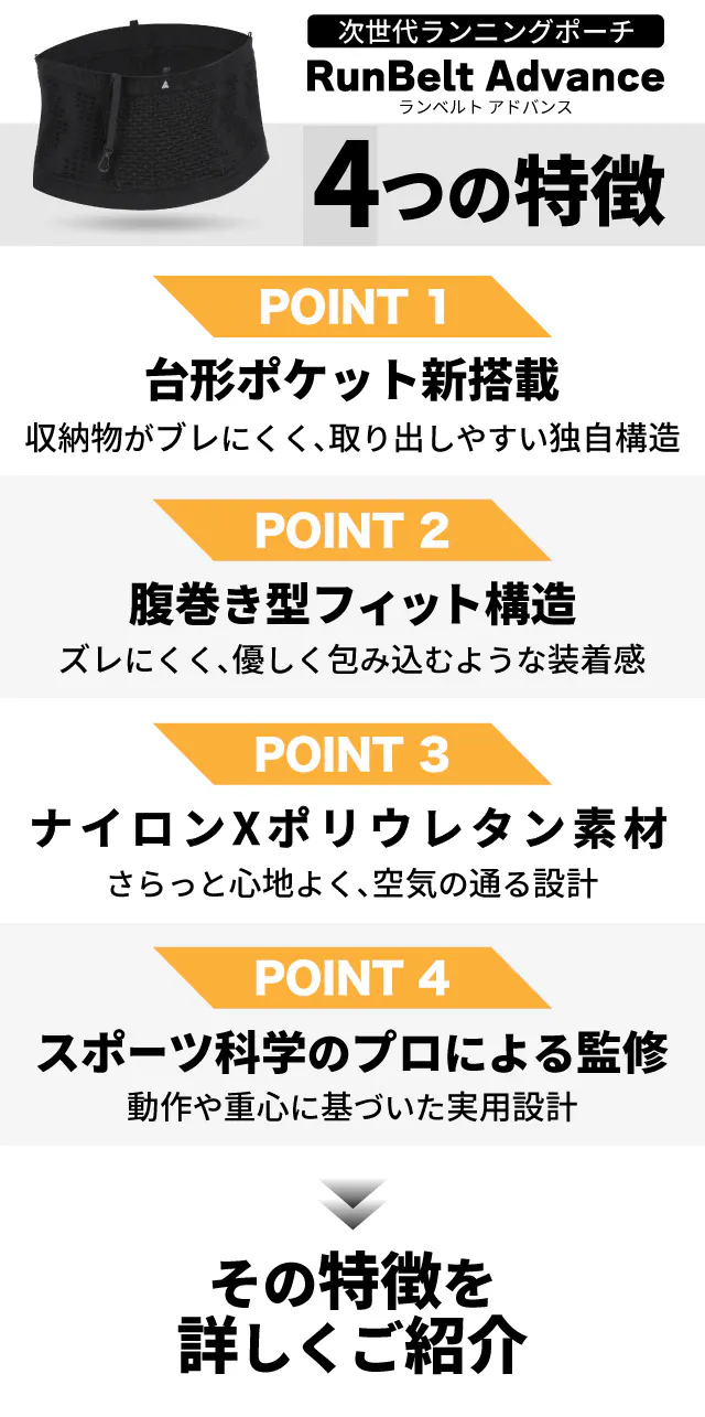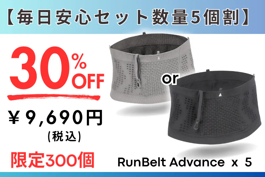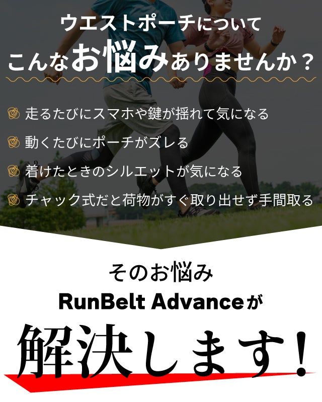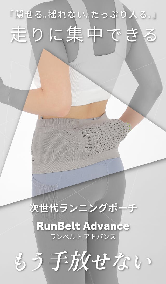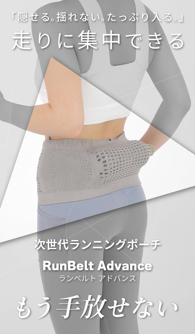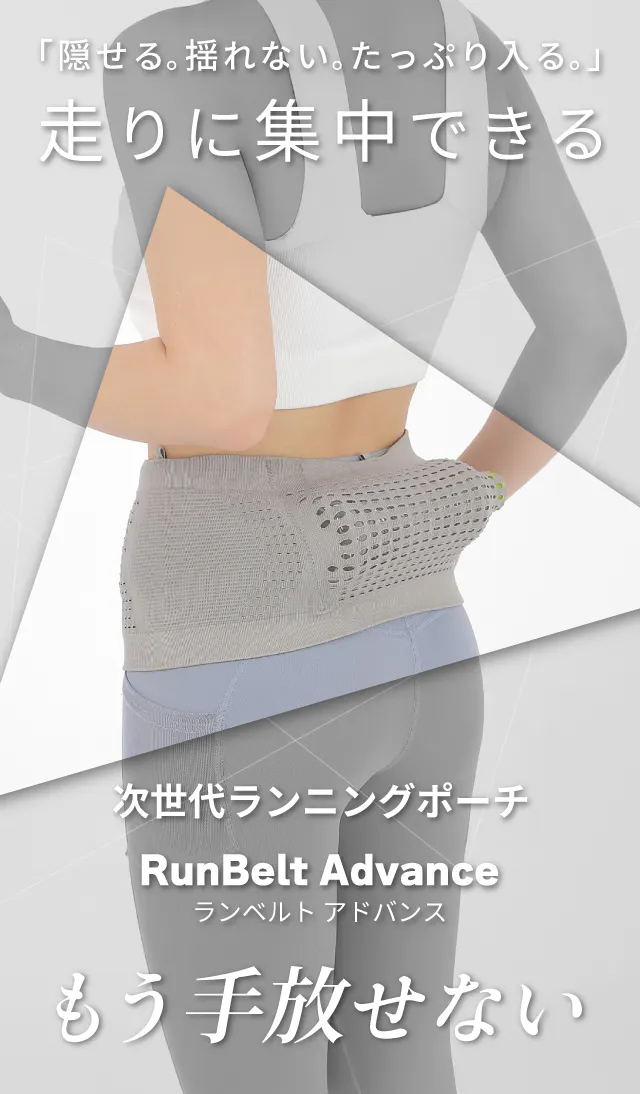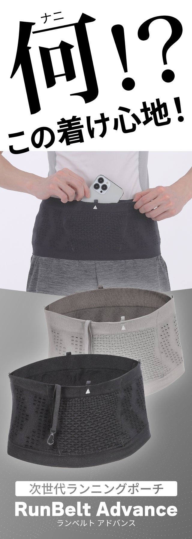 RunBelt Advance(ランベルト アドバンス)は、スマホや鍵、ペットボトルなどが収納できて、“着けていることを忘れるほど快適な”腹巻き型ランニングポーチです。