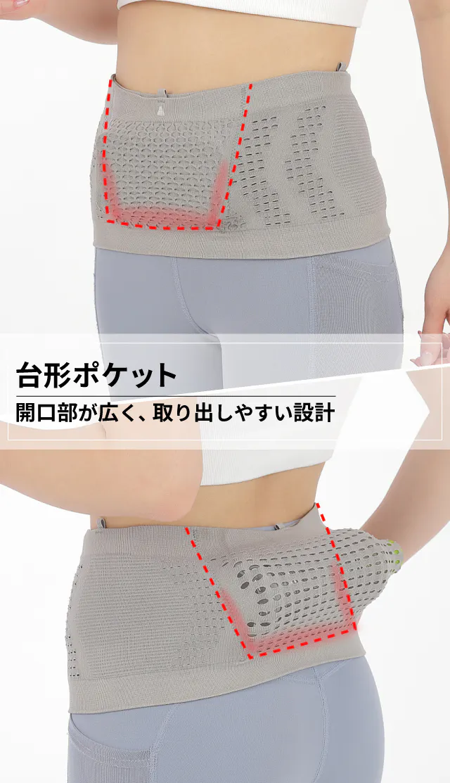 今回の「ランベルト アドバンス」は、そうした経験と実績をもとに、一から構造設計を見直し、より快適で実用的な腹巻型ランニングポーチとして開発しました。現在、この製品の自社新構造の台形ポケットについては実用新案として登録しております。
