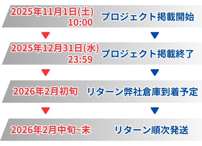●引渡し時期: 各リターン詳細に記載の発送予定⽉を引き渡し時期とします。但し、開発・⽣産状況によって遅れが⽣じる場合がありますのでその際は当プロジェクトページ内の「活動報告」または購⼊者へのメール等で連絡します。
