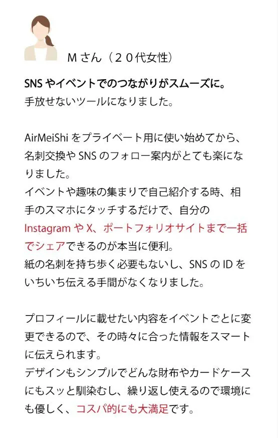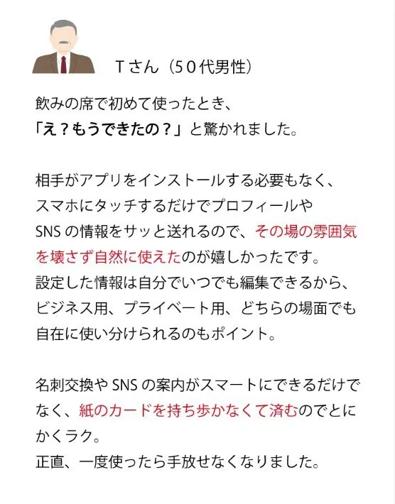 名刺交換の堅苦しさを感じさせず、カジュアルな場面でもスマートに使える、