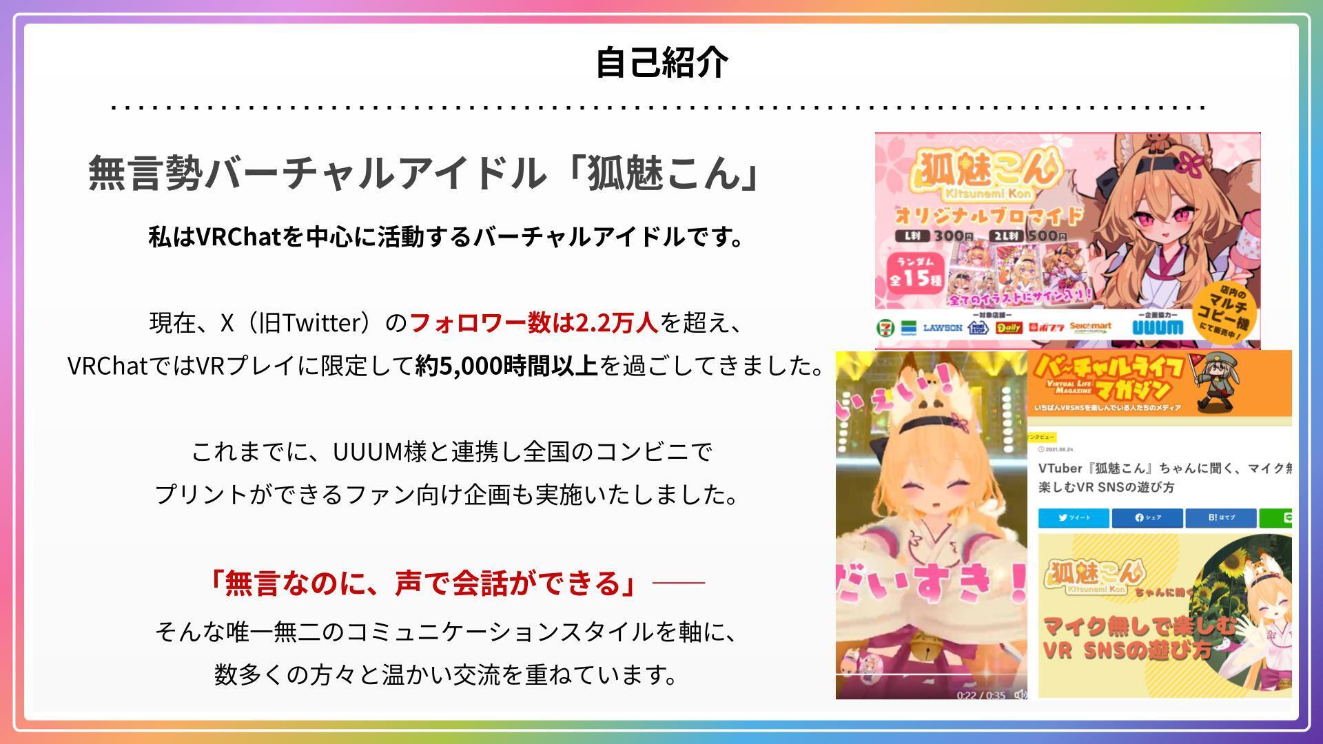 2020年からVRChatを中心に活動している無言勢バーチャルアイドルの「狐魅こん」です。