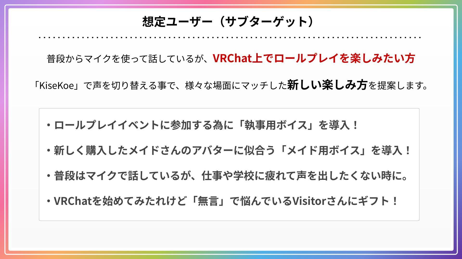 VRChatを楽しんでいる“無言勢”のユーザーに向けて、声でのコミュニケーションやロールプレイをより自然に行える環境を提供することを目的としたプロジェクトです。