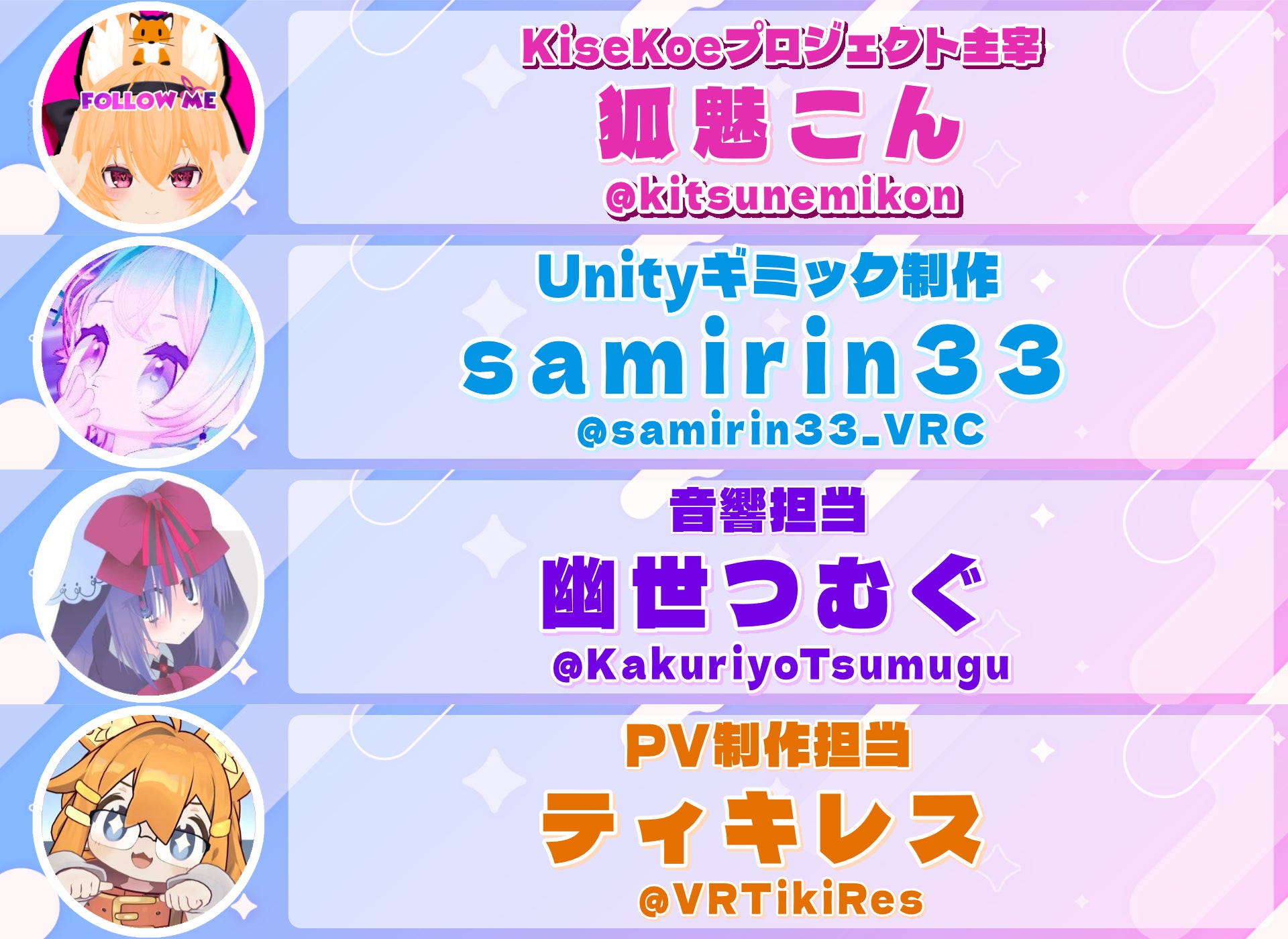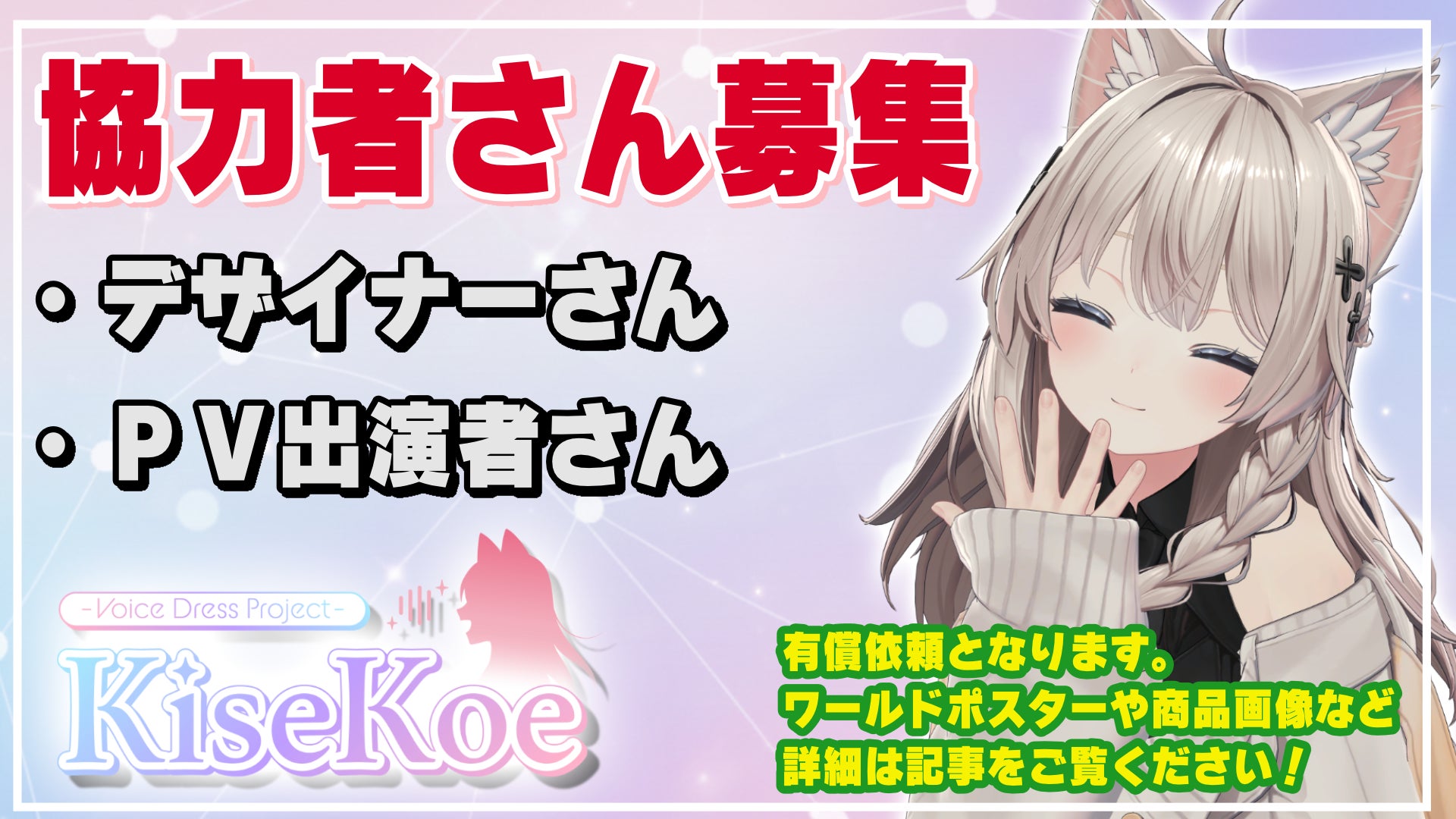 2026/04/04 07:58KiseKoe スタッフ募集のお知らせ現在制作中のVRChat向けボイス商品プロジェクト「KiseKoe」 にて、私たちといっしょに制作をお手伝いいただける方を募集しています!一緒に「KiseKoe」をより良いものにしてくれる方、お待ちしています! 募集①:グラフィックデザイナー▼内容・VRChatワールド用ポスター制作・BOOTH商品画像制作・ワールドギミック用画像 など▼条件・VRChat関係の画像を作成した経験のある方歓迎▼報酬・有償依頼(詳細はDMにてご相談) 募集②:PV動画出演者▼内容・KiseKoeのPV動画への出演、撮影協力▼応募条件・「マヌカ / しなの / 狛乃」のデフォルトアバター所持者(サンプル不可)・フルトラッキングでの撮影が可能な方・VRChat内での撮影にご協力いただける方▼報酬・製品版「KiseKoe」をお渡し 応募方法興味を持っていただけた方は、X(@kitsunemikon)のDM or リプライにてご連絡ください!・簡単な自己紹介・過去の作例(デザイナー応募の場合)などを添えていただけるとスムーズです 最後にKiseKoeは「無言勢でも楽しめる体験」を広げるプロジェクトです。VRChatがもっと楽しくなるような作品を、一緒に作りませんか?ご応募お待ちしています! もっと見る