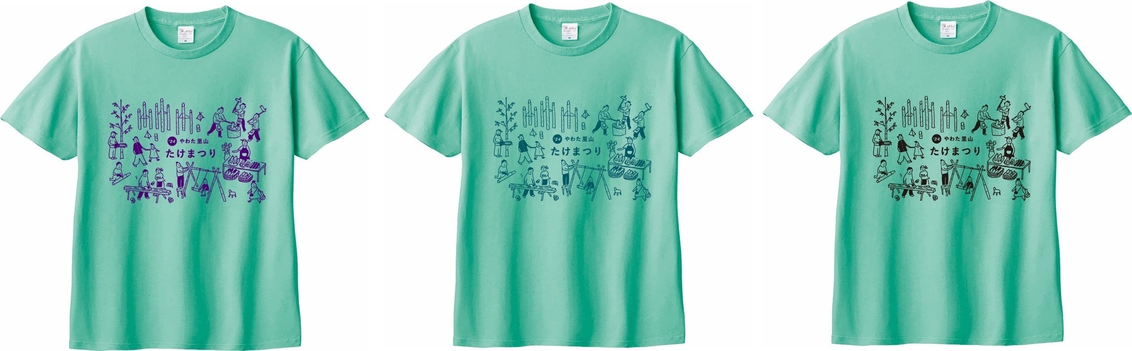 やわた里山たけまつりのオリジナルイラストをデザインしたスタッフTシャツを提供します。サイズ、カラーも準備しております。