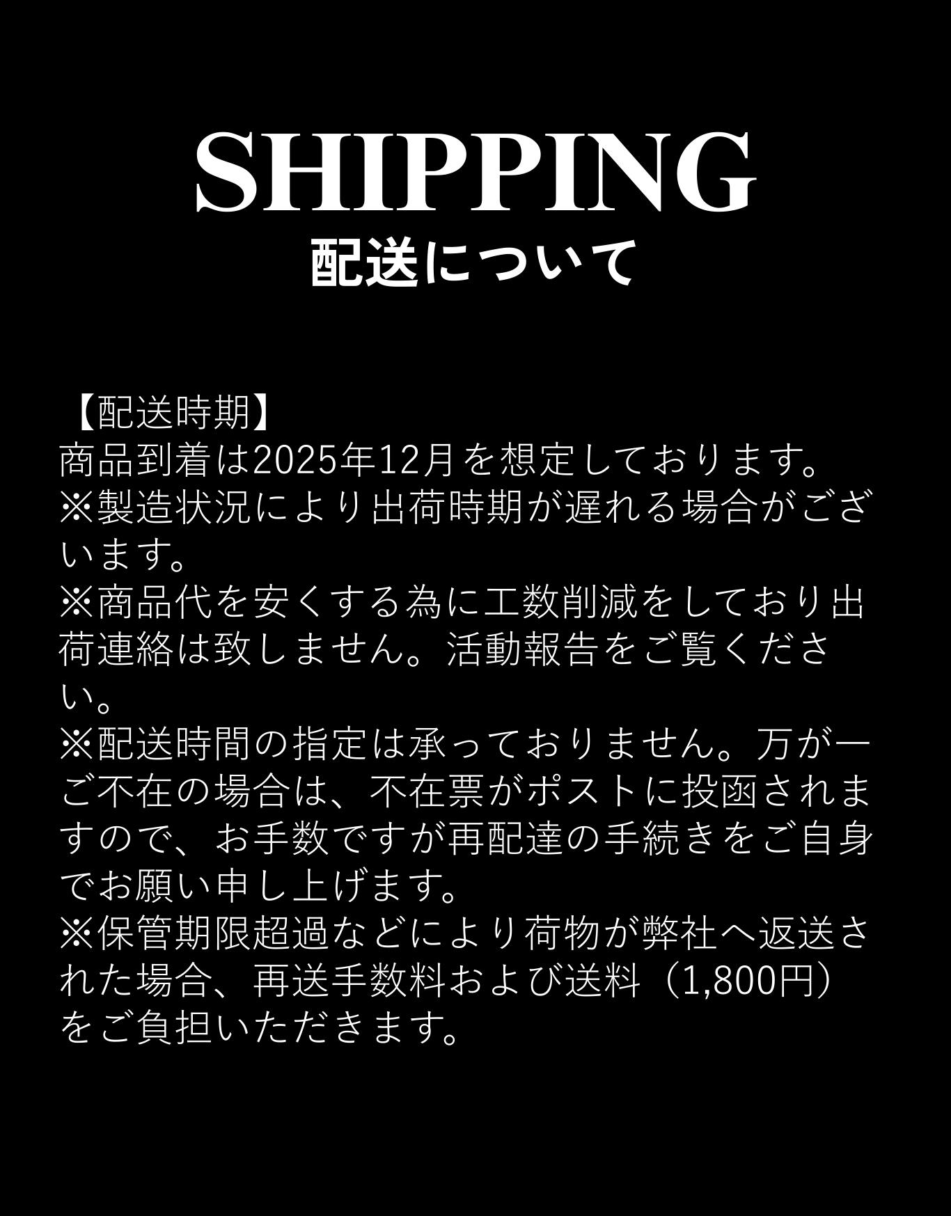 リターン価格:9,600円 (販売予定価格:16,160円) ※リターンはすべて税・送料込みの金額になります。 ※皆様の支援により量産効率が向上した場合、正規販売価格が販売予定価格より下がる可能性もございます。 類似商品が発生する可能性があります。ご了承頂いた上でご支援頂けます様お願い致します。 【配送時期】 商品到着は2025年12月を想定しております。 ※製造状況により出荷時期が遅れる場合がございます。 ※商品代を安くする為に工数削減をしており出荷連絡は致しません。活動報告をご覧ください。 ※配送時間の指定は承っておりません。万が一ご不在の場合は、不在票がポストに投函されますので、お手数ですが再配達の手続きをご自身でお願い申し上げます。 ※保管期限超過などにより荷物が弊社へ返送された場合、再送手数料および送料(1,800円)をご負担いただきます。