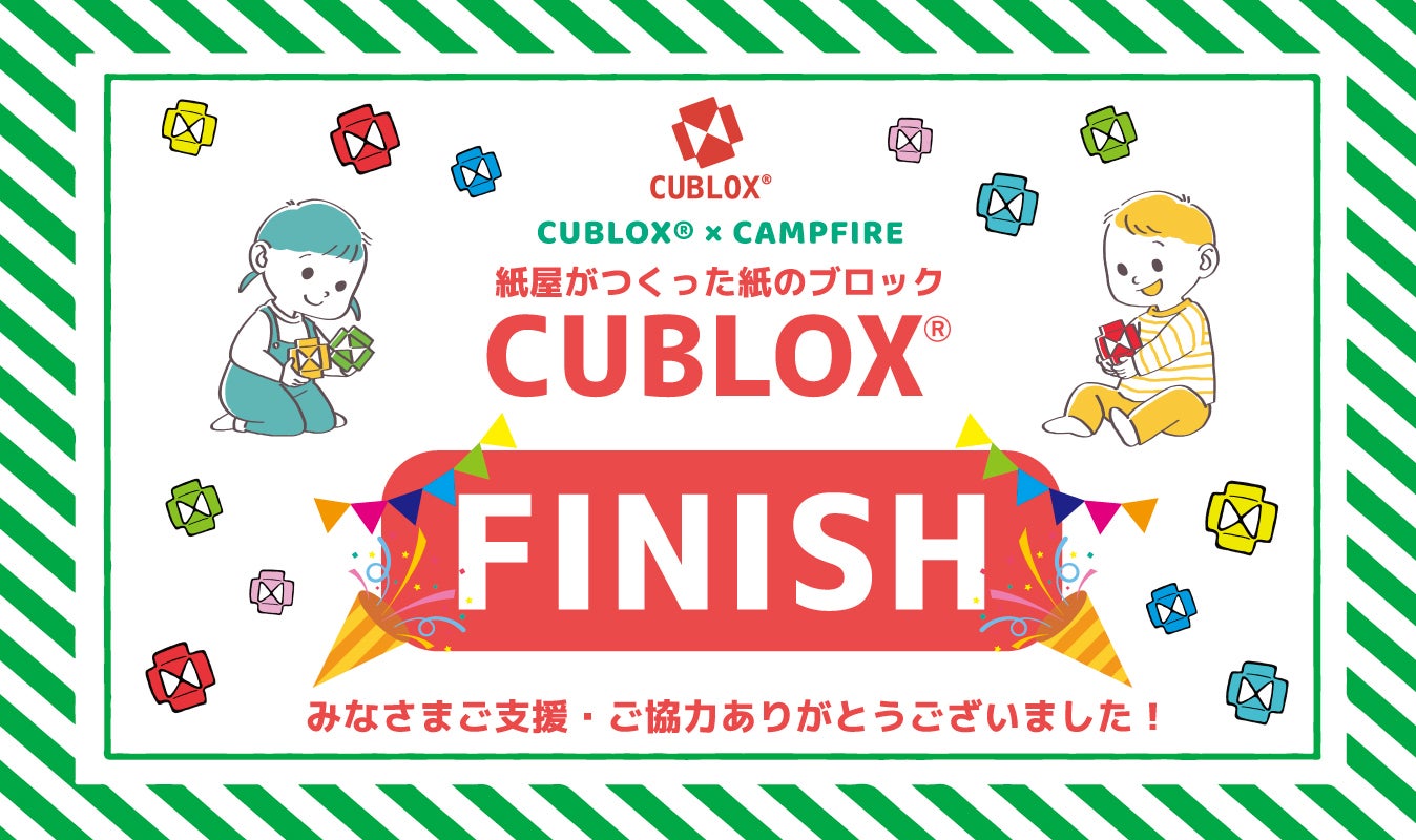 この度は、CUBLOX®プロジェクトに多くのご支援・応援をいただき、誠にありがとうございました。 おかげさまで、支援者数 115名 支援総額 563,870円という、大きなご支援をいただき、無事に公開期間を終了することが出来ました。期間中は、温かいご支援はもちろん、応援メッセージなど、たくさんのお力をいただき、心より感謝申し上げます。これよりリターン品発送準備を進めてまいります。お手元に届くのを楽しみにお待ち頂けましたら幸いです。改めて、本プロジェクトに関わってくださったすべての皆さまへ、心より御礼申し上げます。皆さまのご支援を力に、これからもCUBLOX®を通して紙の魅力、可能性、並びにアナログの楽しさを発信し続けていく所存です。今後とも引き続きCUBLOX®をよろしくお願い申し上げます。株式会社市瀬