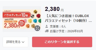 2026/01/20 12:00いつもCUBLOX®プロジェクトを応援いただき、誠にありがとうございます。【CUBLOXバラエティセット(10個分)】について予定数量達成出来ましたこと、改めて感謝申し上げます。【CUBLOXバラエティセット(10個分)】リターン品の準備が整いました!「もう一度購入したい」「初めてなので、バラエティセットから始めたい」といったお声を受け、追加に至りました。 1/31までの公開となっております。是非この機会にご検討いただけますと幸いです。引き続き、皆さまと一緒にCUBLOX®を育てていけたら嬉しいです。最後まで応援・ご支援のほど、どうぞよろしくお願いいたします。株式会社市瀬 もっと見る