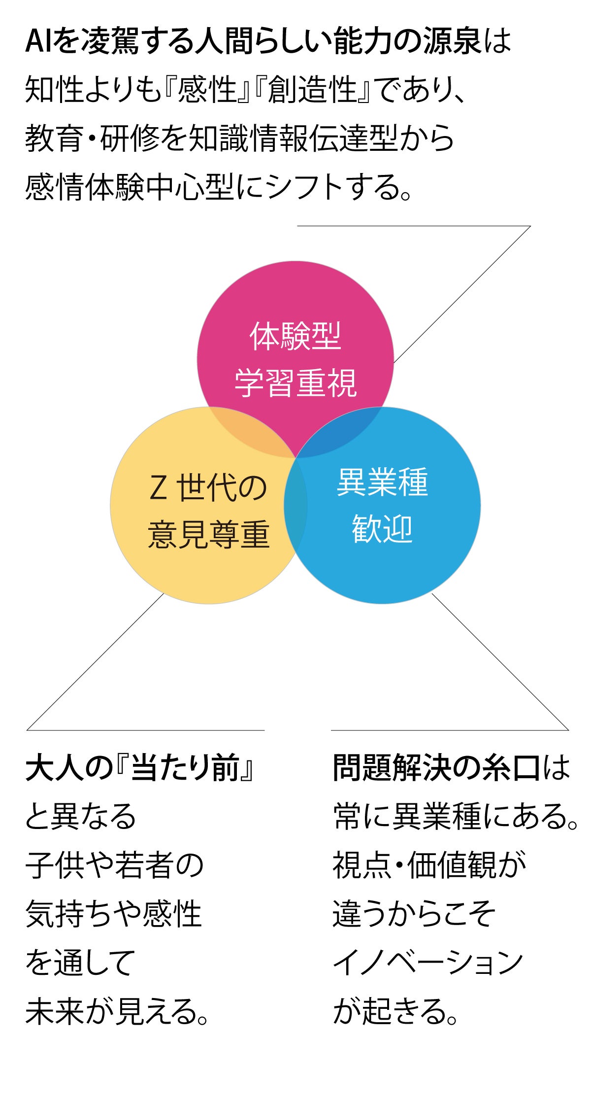 Z世代の視点を尊重: 大人が当たり前だと思っていることも、若い世代にとっては全く違うかもしれません。学生や子どもたちの声に耳を傾け、彼らの感性から新たな気づきを得ます。