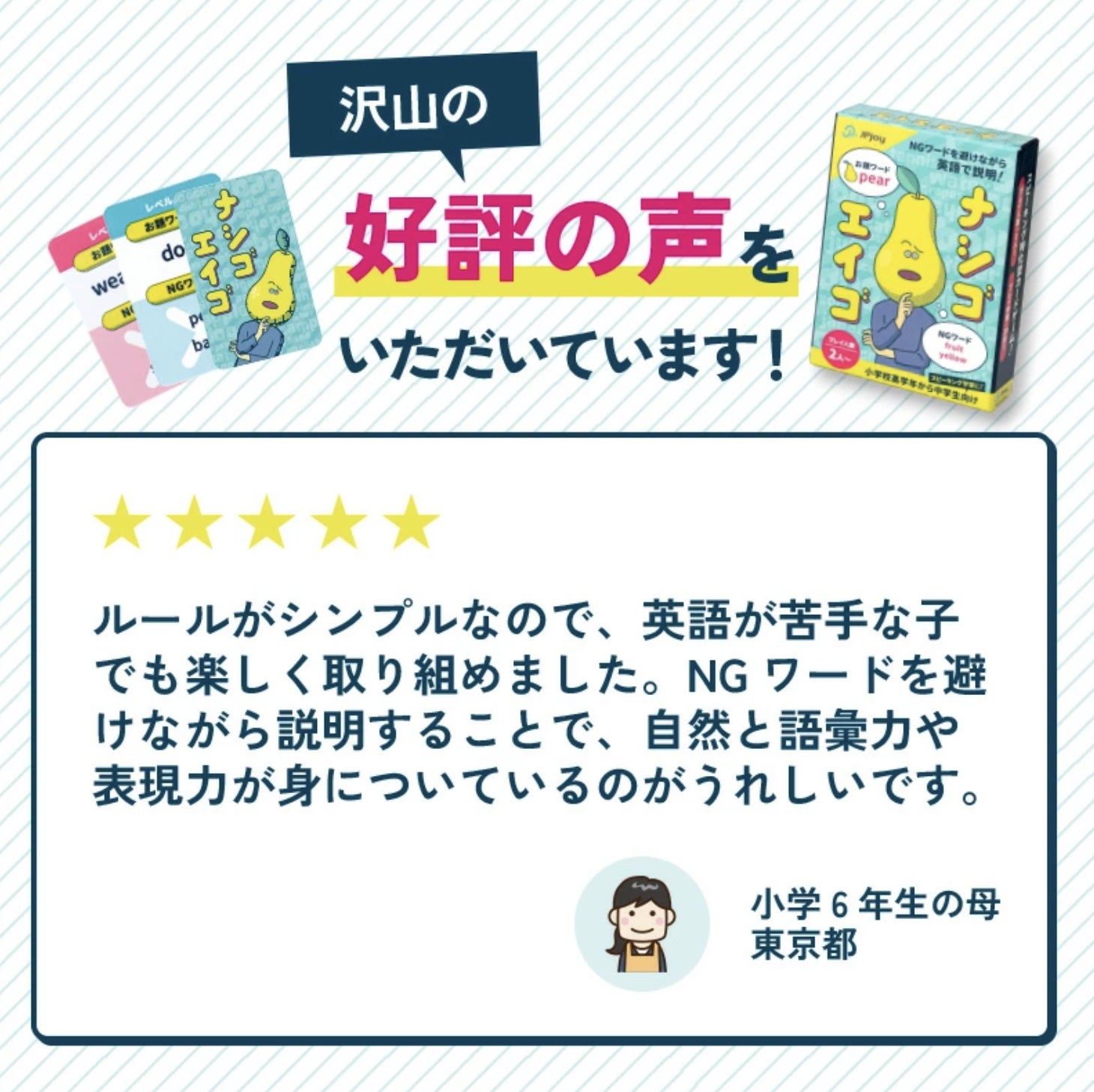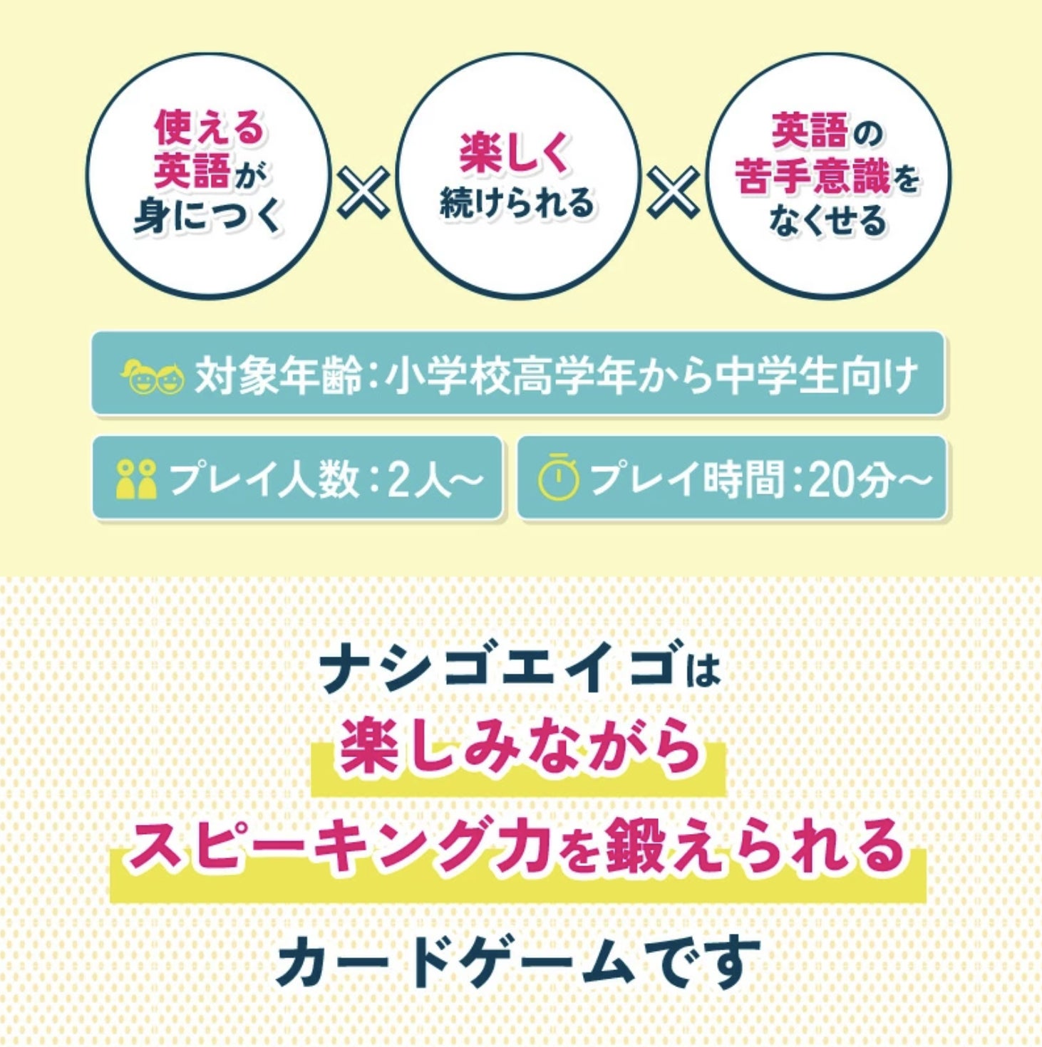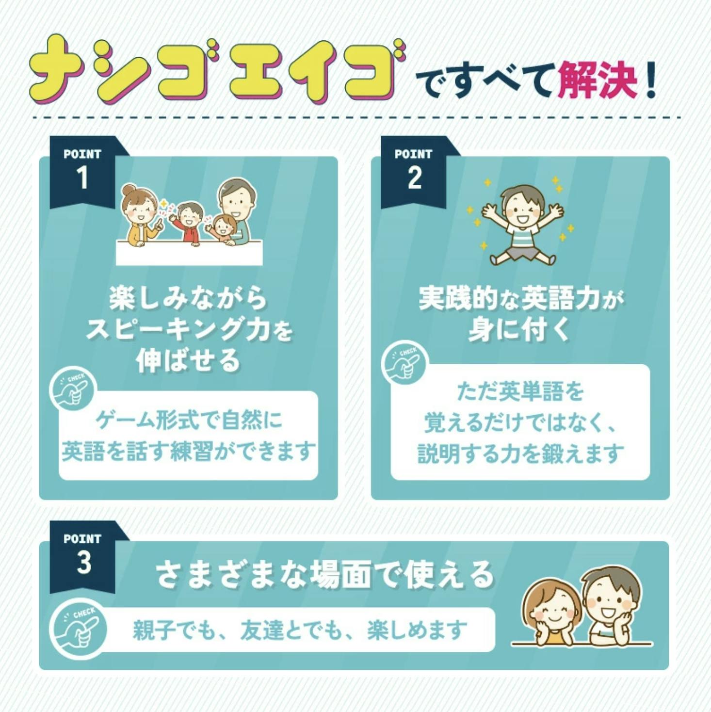 私たちナシゴエイゴの製作陣は、英語は「正解を覚える」ものではなく、「伝えたい気持ちをどう表すか」を楽しむものだと思っています。このゲームを通して、子どもも大人も「伝えるって面白い!」と感じられる時間を増やしたいといった願いを込めて作りました。