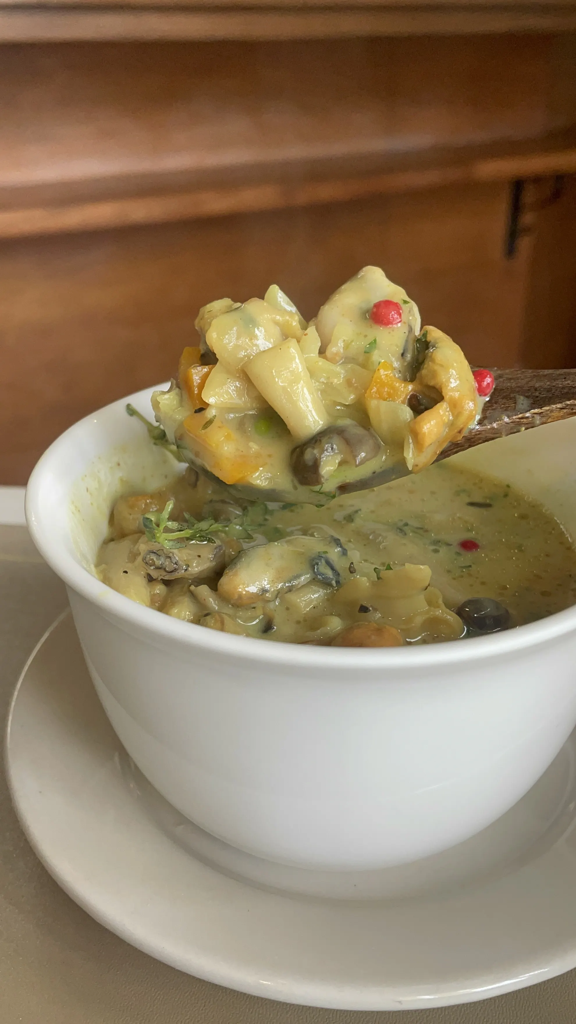 牛乳やクリームの味だけに頼らず、牡蠣とアサリのだし汁を丁寧に使い旨味を増強、長く煮込む具材と最後に加えるフレッシュな具材を組み合わせて、味に奥行きを出しています。