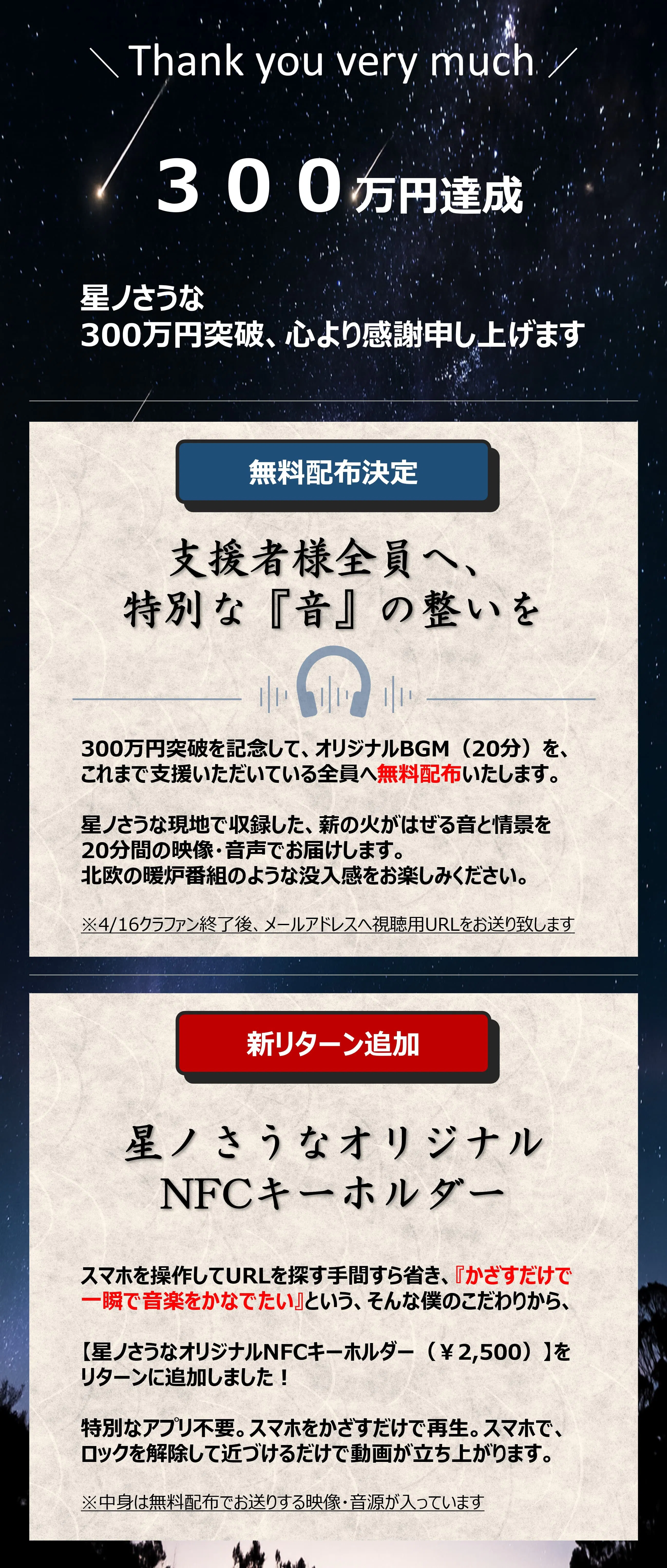 2026/03/31 11:44星ノさうな、大変嬉しいことにご支援300万円を突破いたしました!!予想をはるか超え、こんなにも大勢の方から、ご支援いただけたことを非常に嬉しく存じます。誠に、ありがとうございます。突破を記念し、ささやかではありますが、ご支援いただいている方全員へ、星ノさうなオリジナルヒーリングBGMを無料配布させていただくことに致しました♪オープンに向け、サウナの建設、別荘のリフォームも進んでいます!!引き続き応援をよろしくお願い致します。 もっと見る