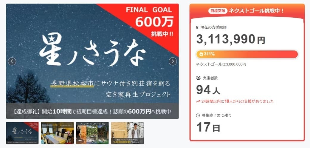 ・300万円達成で、より贅沢なサウナ小屋の夢が叶います。