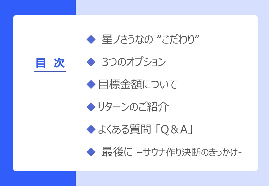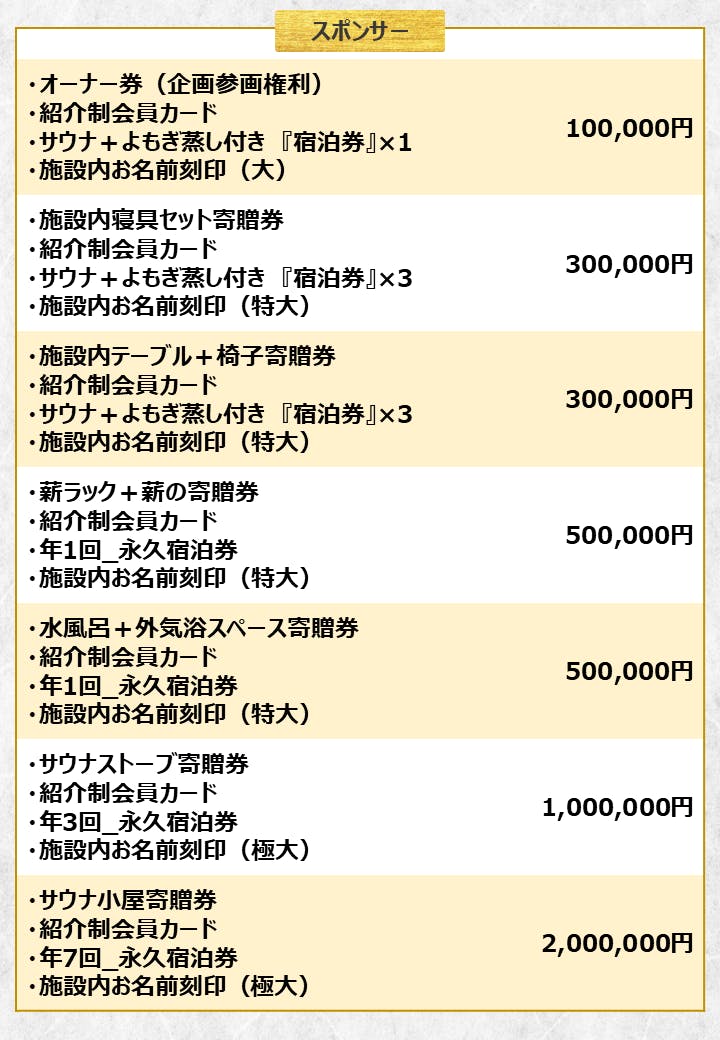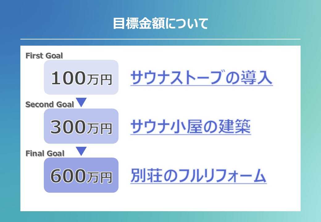 ・300万円達成で、より贅沢なサウナ小屋の夢が叶います。