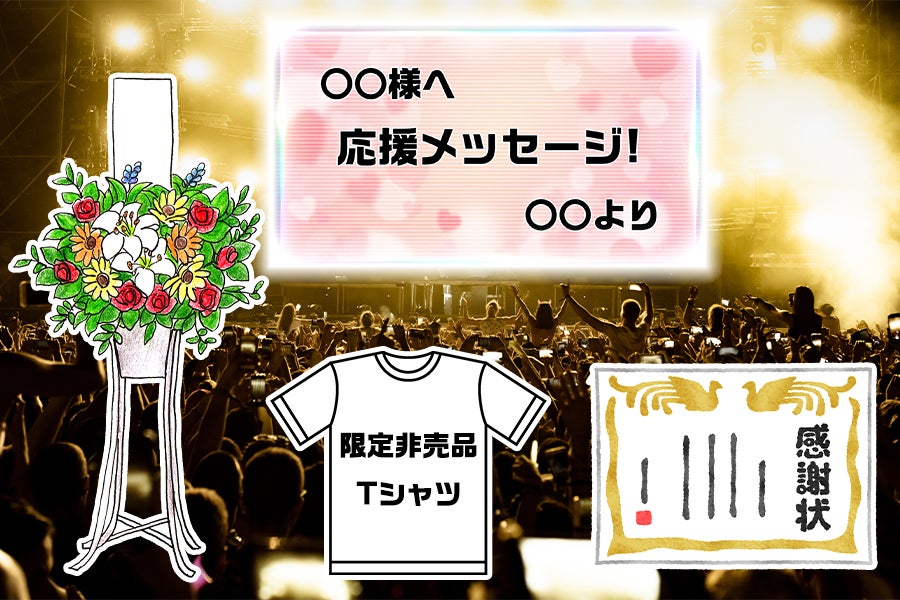 今回は、会場を彩る『ビッグアートウォール』や会場の巨大スクリーンに流れる『推しへの応援メッセージ!』あなたの応援がそのまま推しに届く『ケータリング』などのリターンをご用意しました。