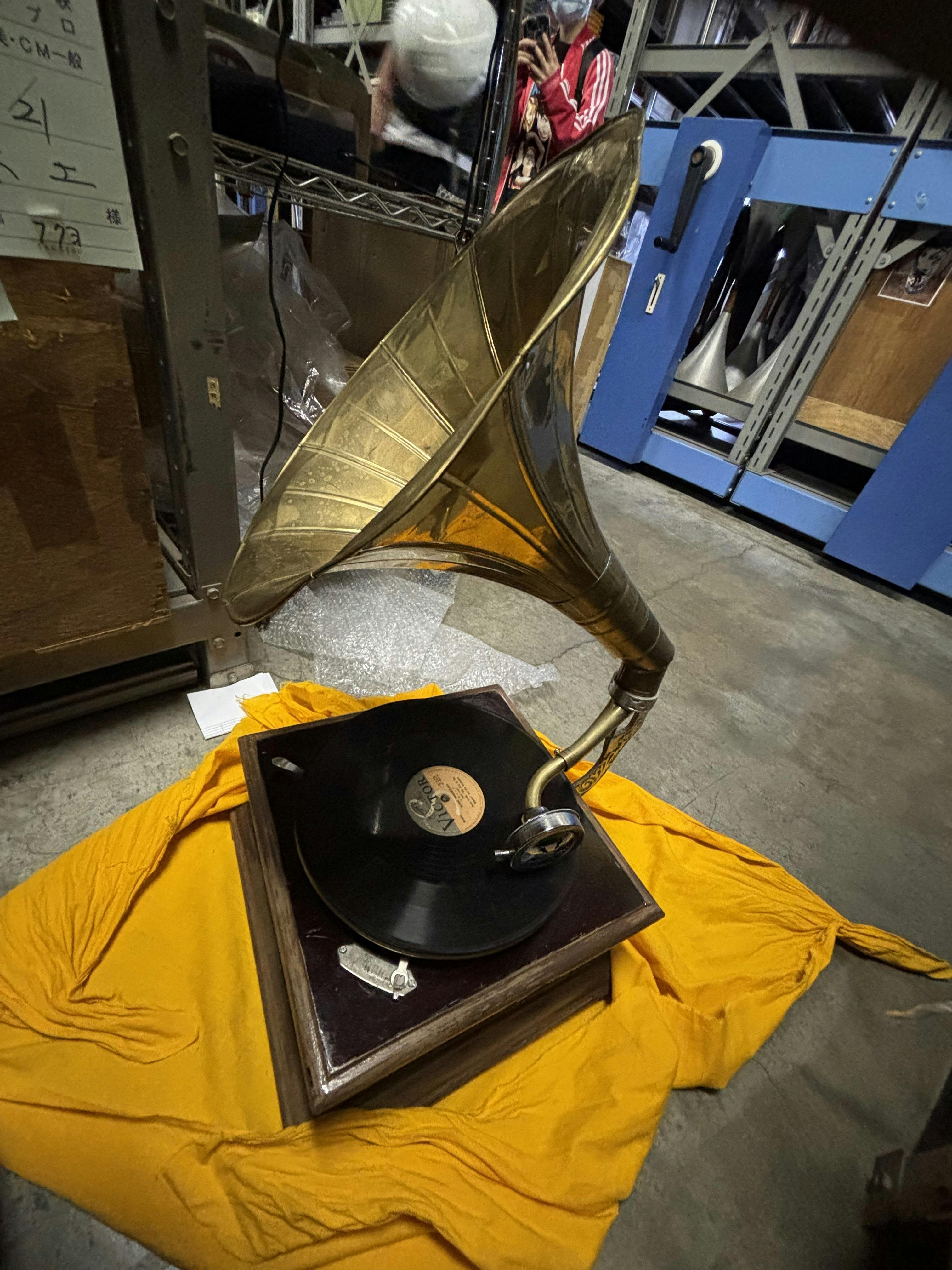 蓄音機やアンティークのテーブル、椅子、鉄瓶などなど。