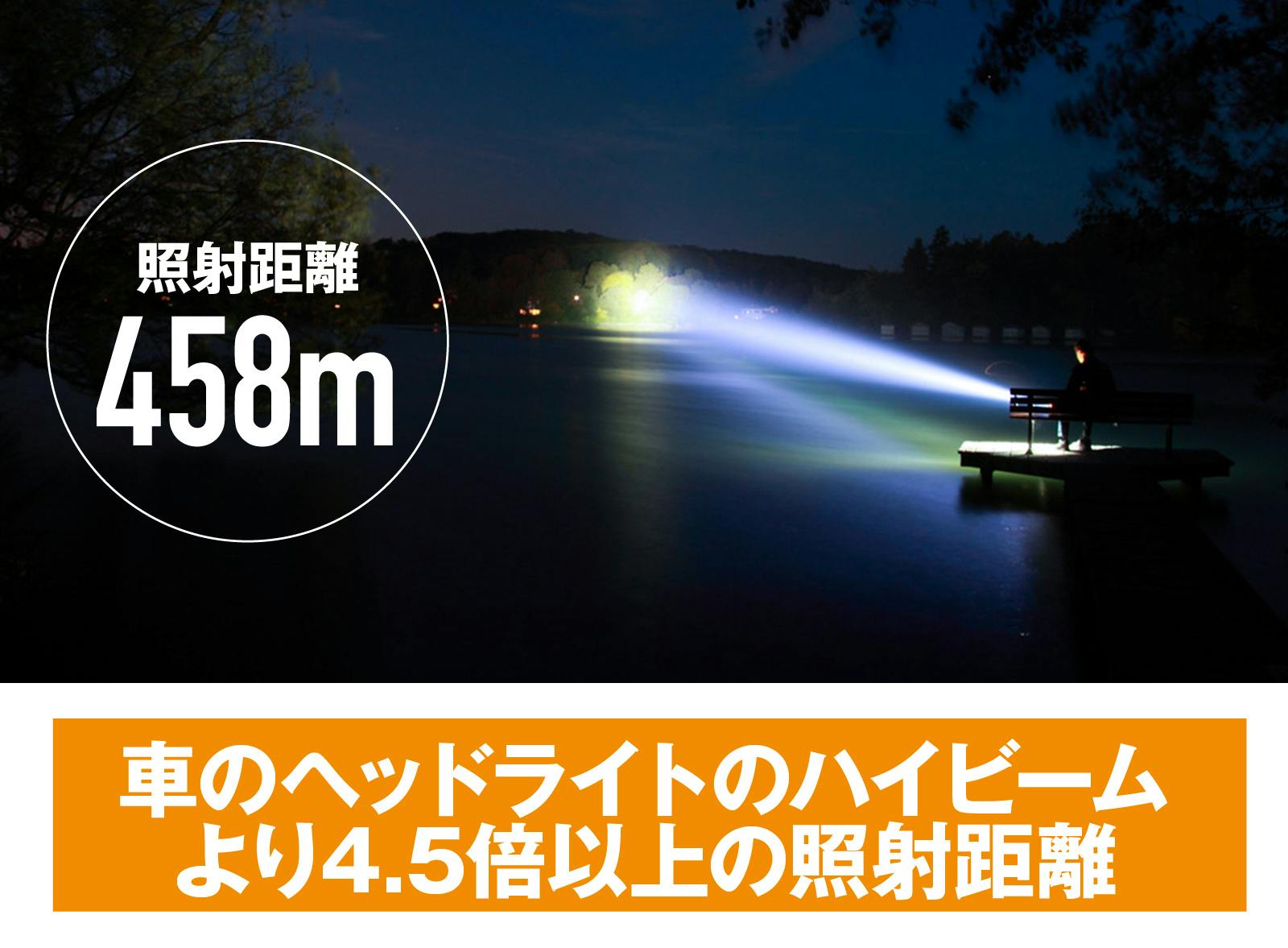 車のヘッドライトのハイビームが100m程度なので、実に4.5倍以上の照射距離を誇ります。