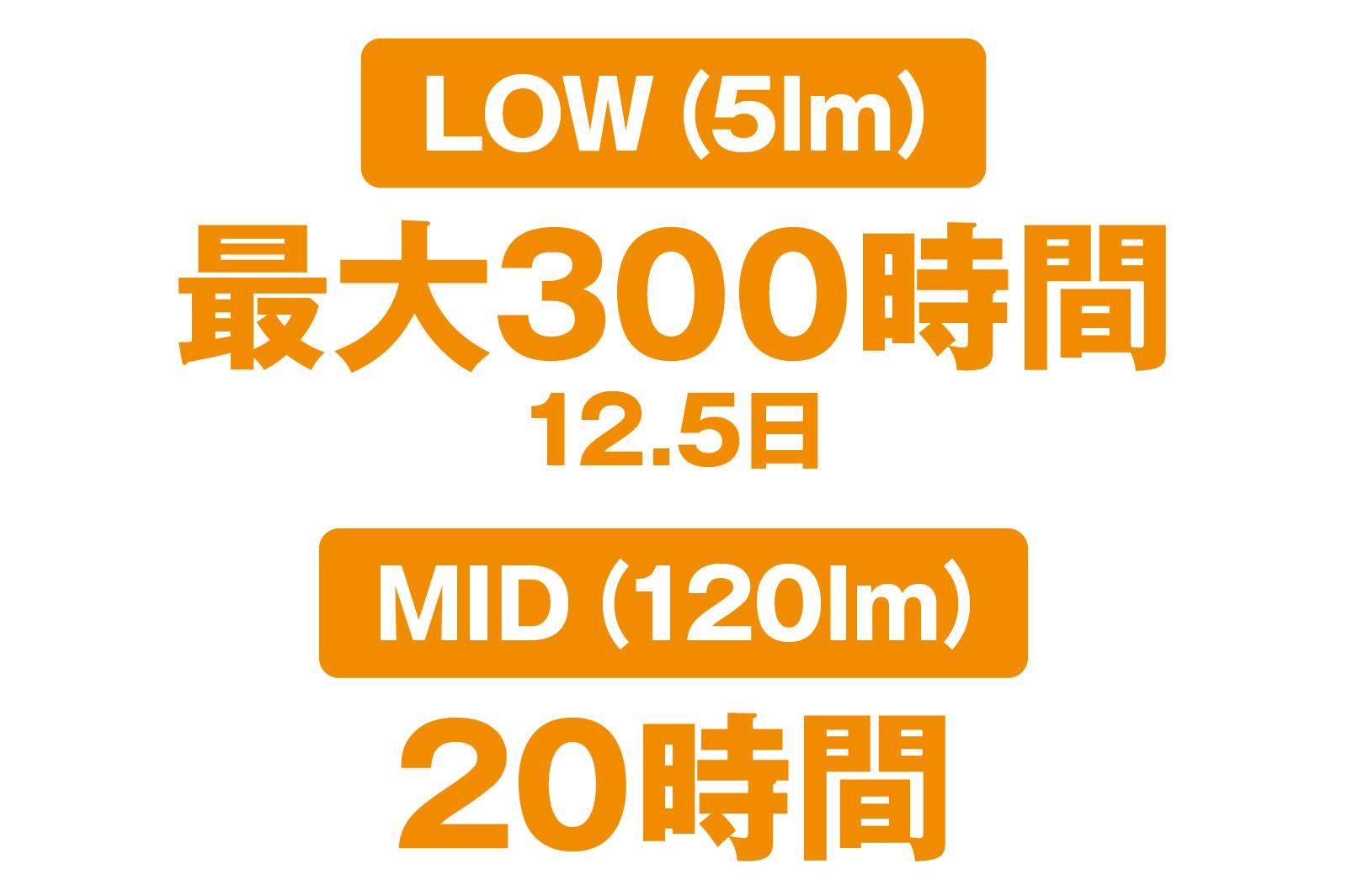 一般的な懐中電灯の光量のMID(120lm)なら20時間点灯します。