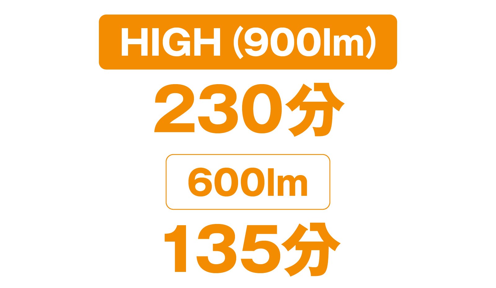 また夜警で使うHIGH(900lm)は230分、最大光量のターボ以後に切り替わる600lmの光では135分も使用できます。