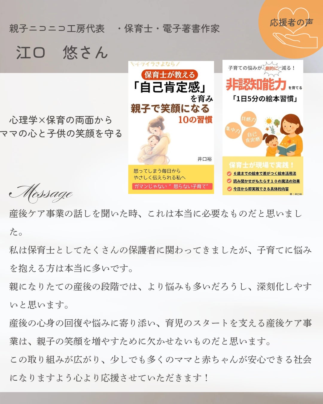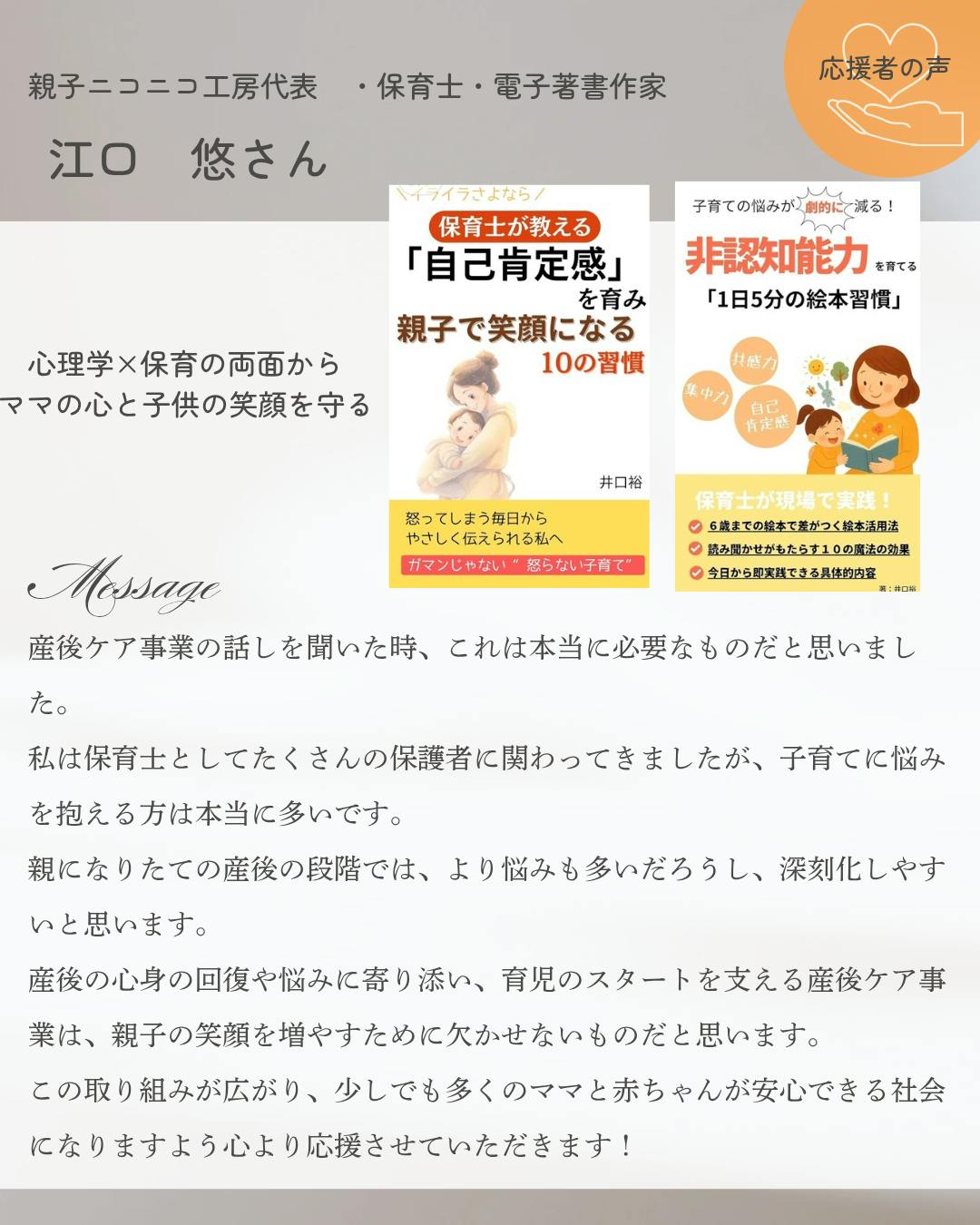 わたしがしてもらったように、次は困っているママを応援したい。