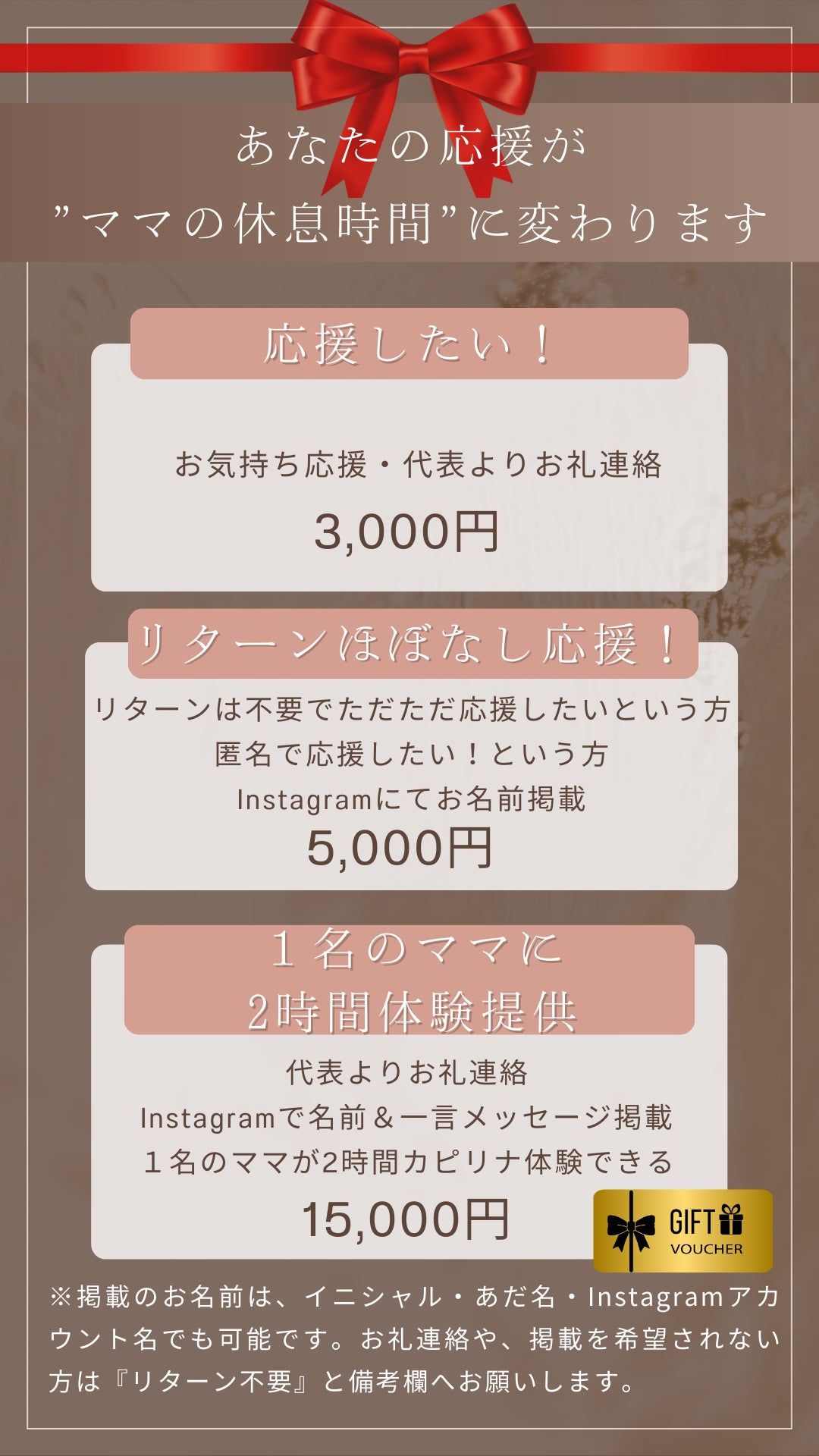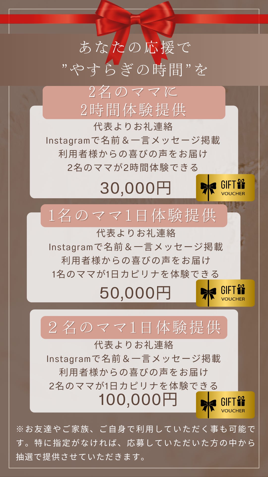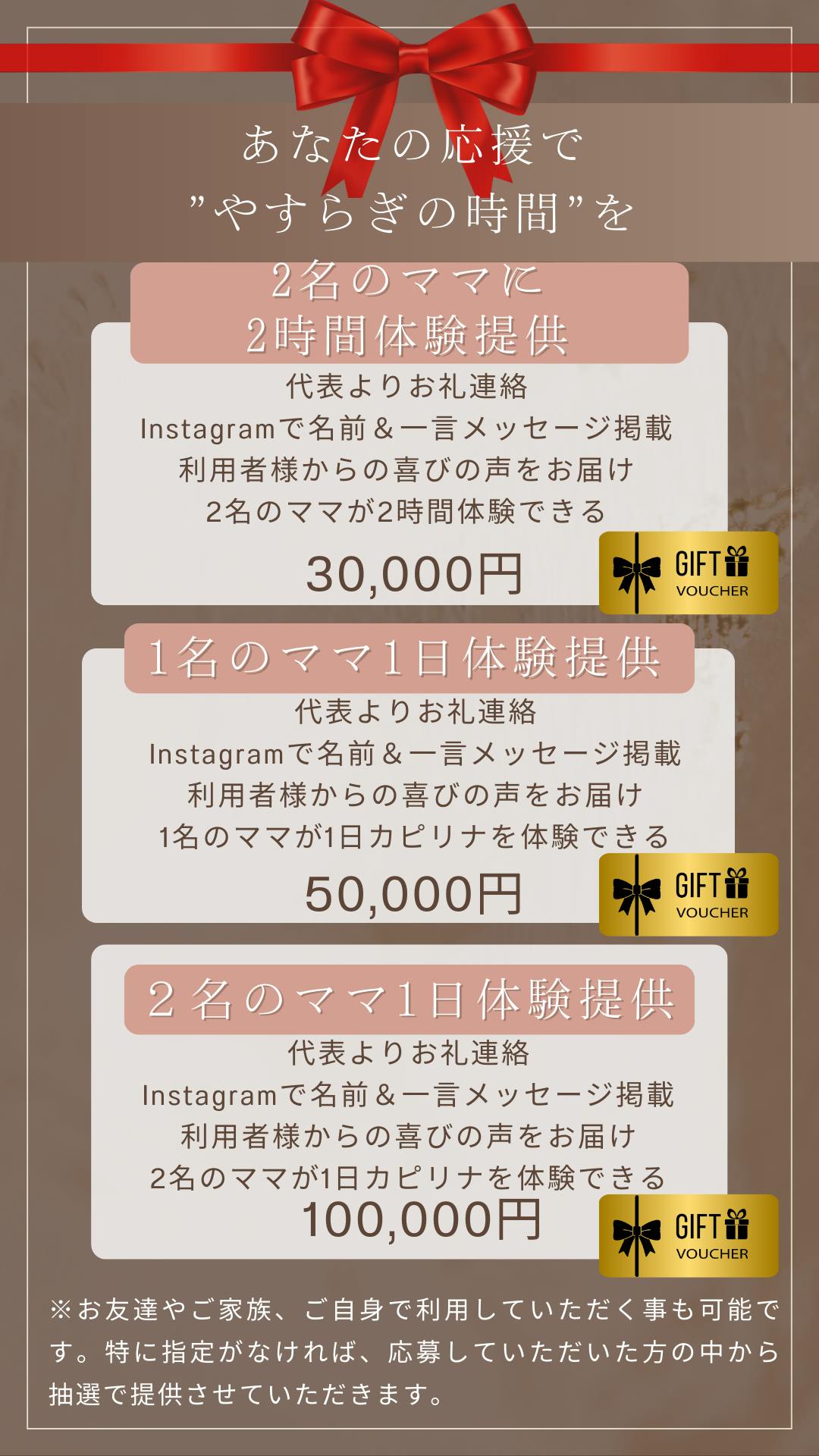 利用希望のママにInstagramの告知投稿をシャアしていただき、その中から抽選でご支援していただいた分でご招待させていただきます。(2026年1月~3月)