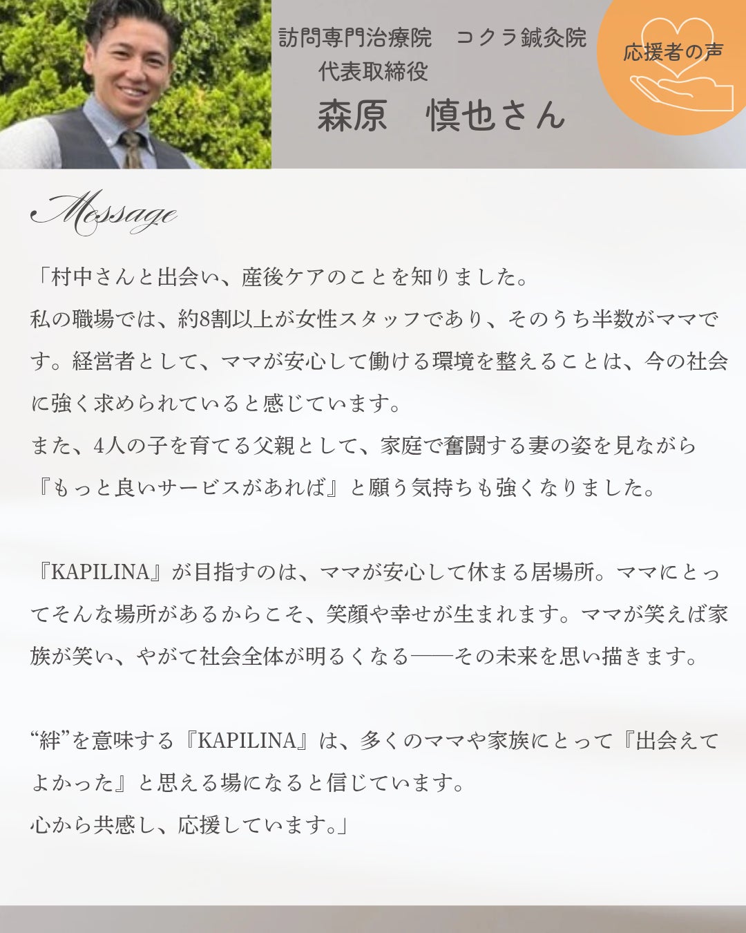 私たち「カピリナ」が目指すのは、そんな “産後ケアが当たり前に受けられる未来” です。