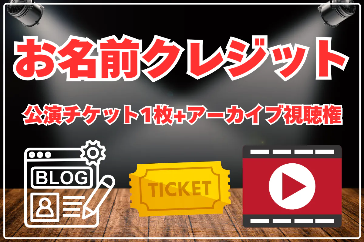 | 100,000円 | 【プレミアムスポンサー】限定オンライン舞台裏トークイベント招待 + VIP席の公演チケット(任意の日時、購入後に希望日時を確定、回数不問) + アーカイブ視聴権 + お名前クレジット(アメブロ) + 舞台パンフレットにお名前掲載 + 劇中での特別クレジット |