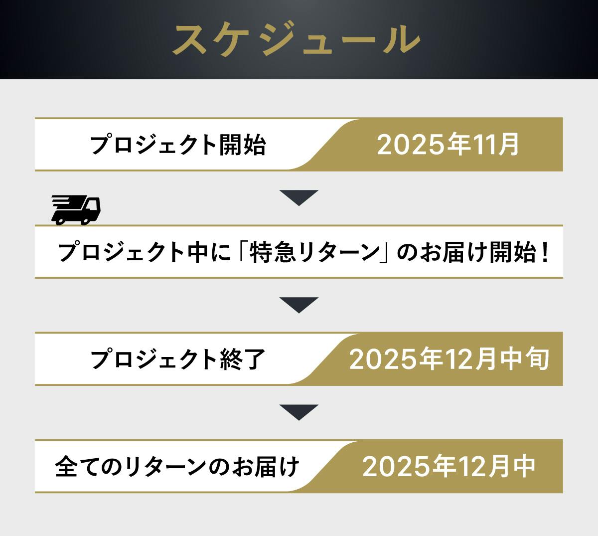 ※本文中に記載させていただいたスケジュールは、あくまでプロジェクト公開時点の予定です。ご支援の性質上、配送遅延のおそれがございます。原則として、配送遅延に伴うご支援のキャンセルはできませんが、リターン配送予定月から3ヵ月を超えた場合には、希望者に限りキャンセルにて対応させていただきます。