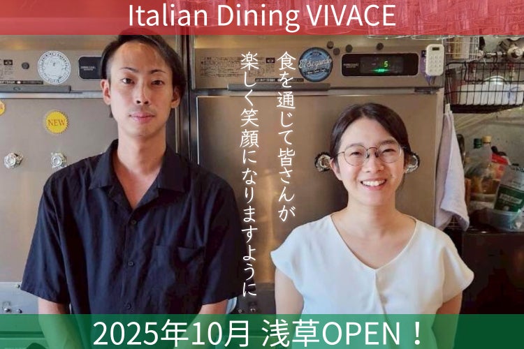 浅草に“心のよりどころ”となるクラシカルイタリアン【Italian Dining VIVACE】をオープン!15年以上イタリアンの現場で腕を磨いたシェフが、小皿料理で楽しむクラシカルな一皿をご提供。生産者の想いを込めた食材と共に「食の大切さ」を伝え、地域の人々が気軽に集い、つながるダイニングを目指します。近隣店舗と協力した子ども食堂やイベントも開催し、浅草のまちに笑顔と温もりを広げていきます。