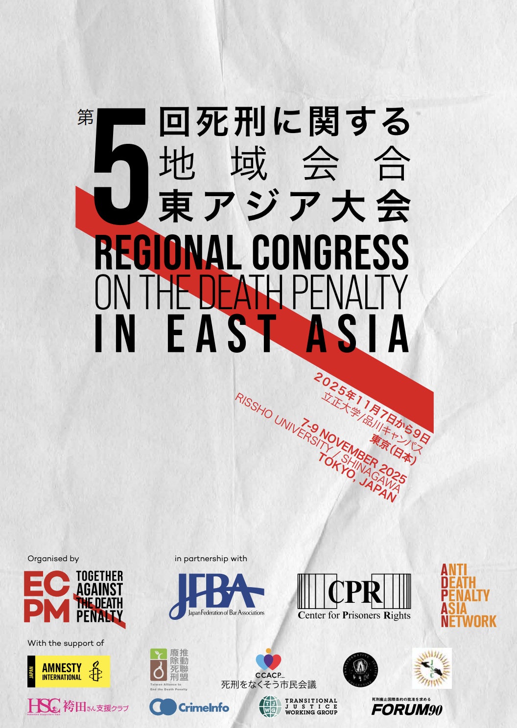 佐藤舞さんは、2025年11月7日(金)~9日(日)にかけて立正大学で開催される「第5回死刑に関する地域会合」に、ご登壇される予定です。これは、フランスの非政府組織ECPM(Ensemble Contre la Peine de Mort)が、3年に一度、世界各地で死刑廃止世界会議を主催して開催するものです。2026年に開催される死刑廃止世界会議に向け、この度、東アジアに焦点を当てた地域会合が東京で開催されます。