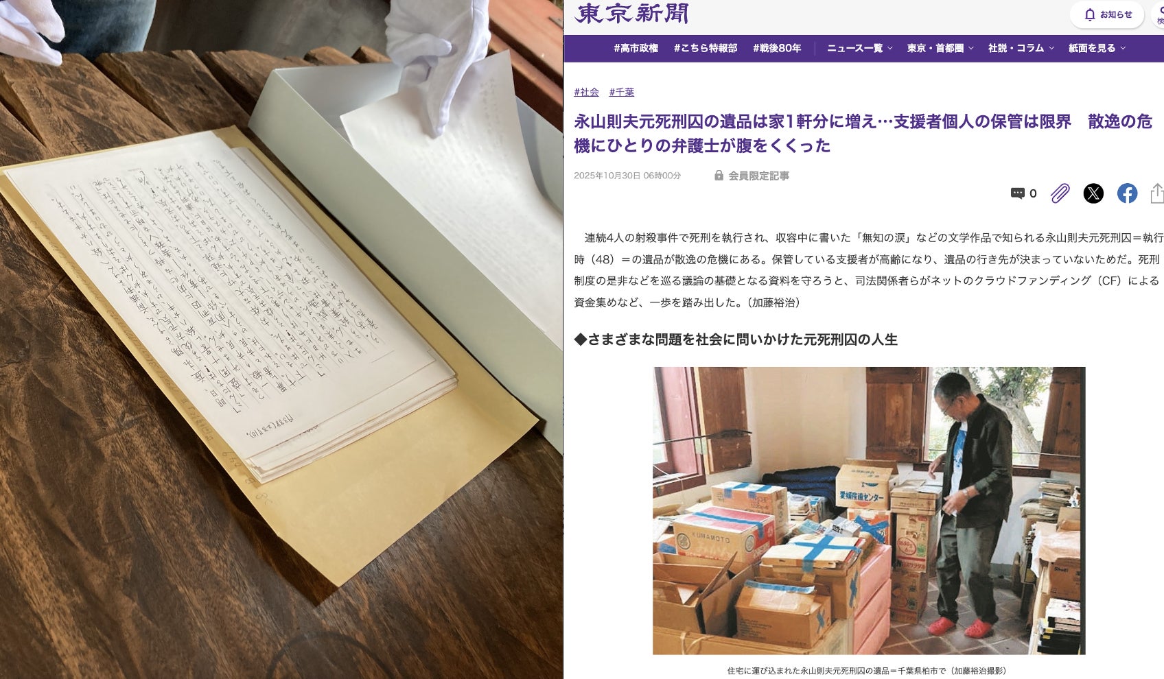 "連続4人の射殺事件で死刑を執行され、収容中に書いた「無知の涙」などの文学作品で知られる永山則夫元死刑囚=執行時(48)=の遺品が散逸の危機にある。保管している支援者が高齢になり、遺品の行き先が決まっていないためだ。死刑制度の是非などを巡る議論の基礎となる資料を守ろうと、司法関係者らがネットのクラウドファンディング(CF)による資金集めなど、一歩を踏み出した。"(記事冒頭より)