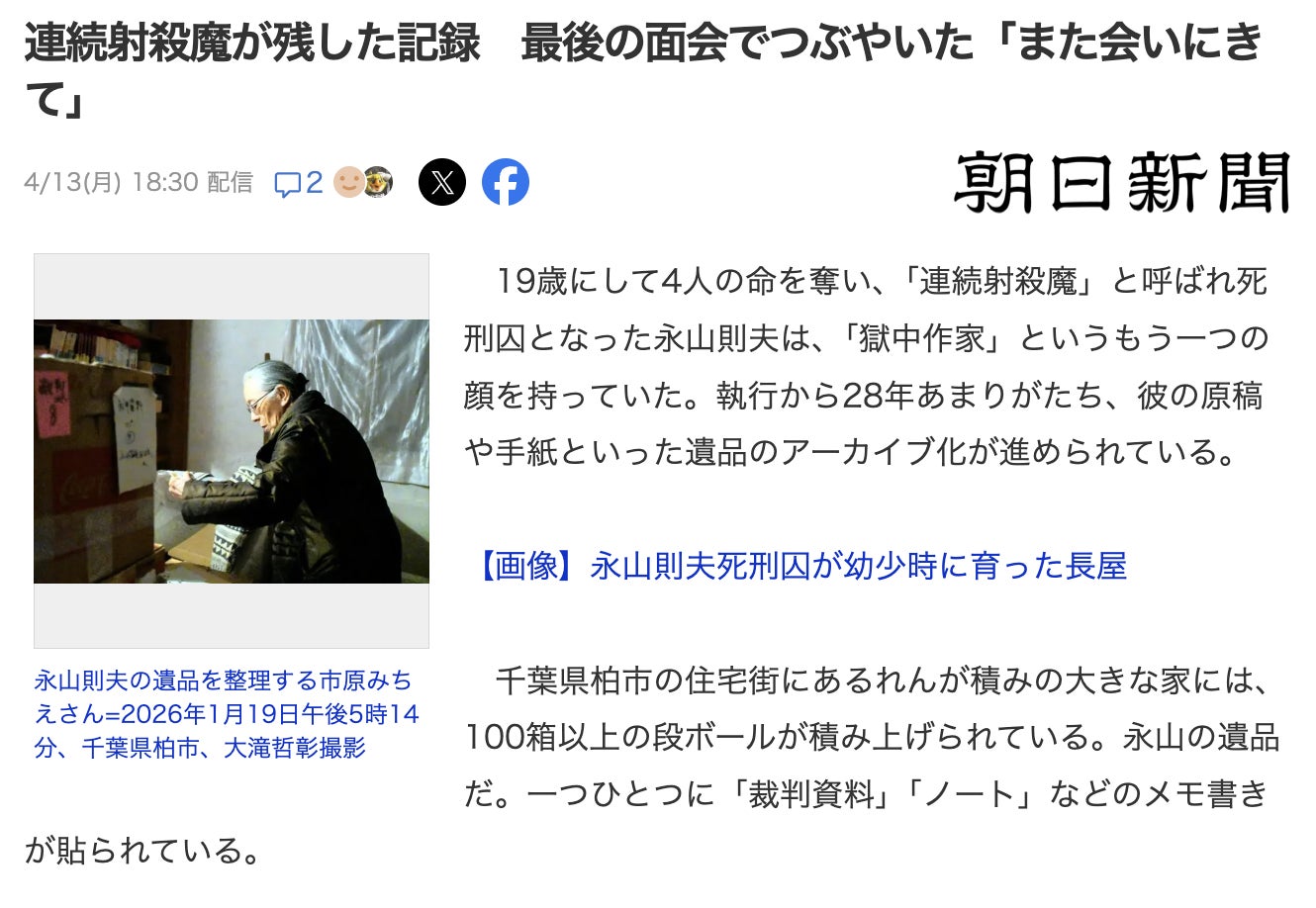 すでにご覧になられている方もいるかもしれませんが、朝日新聞の記事「連続射殺魔が残した記録 最後の面会でつぶやいた「また会いにきて」」が掲載されました。Yahoo ニュースにもなりましたので、全文をご覧いただけます。
