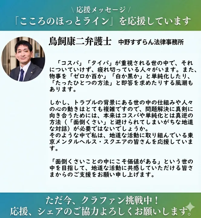 弁護士として、ご活躍をされていらっしゃる先生の力強いお言葉は私たちのパワーになります。