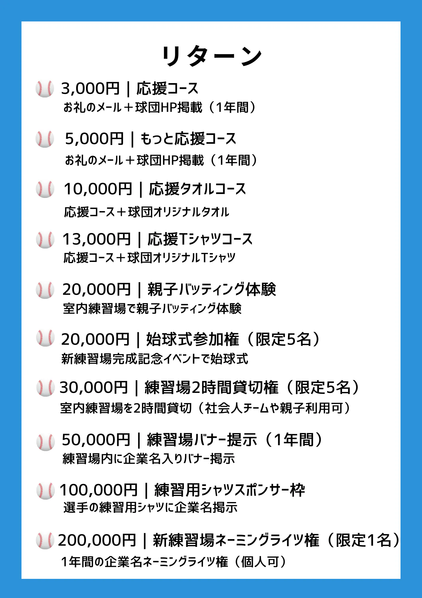 どうか、この挑戦に力を貸してください。あなたのご支援が、子どもたちに「夢を追い続けられる環境」を届けます。そして、この街から未来の球児たちが羽ばたいていく大きな力となります。