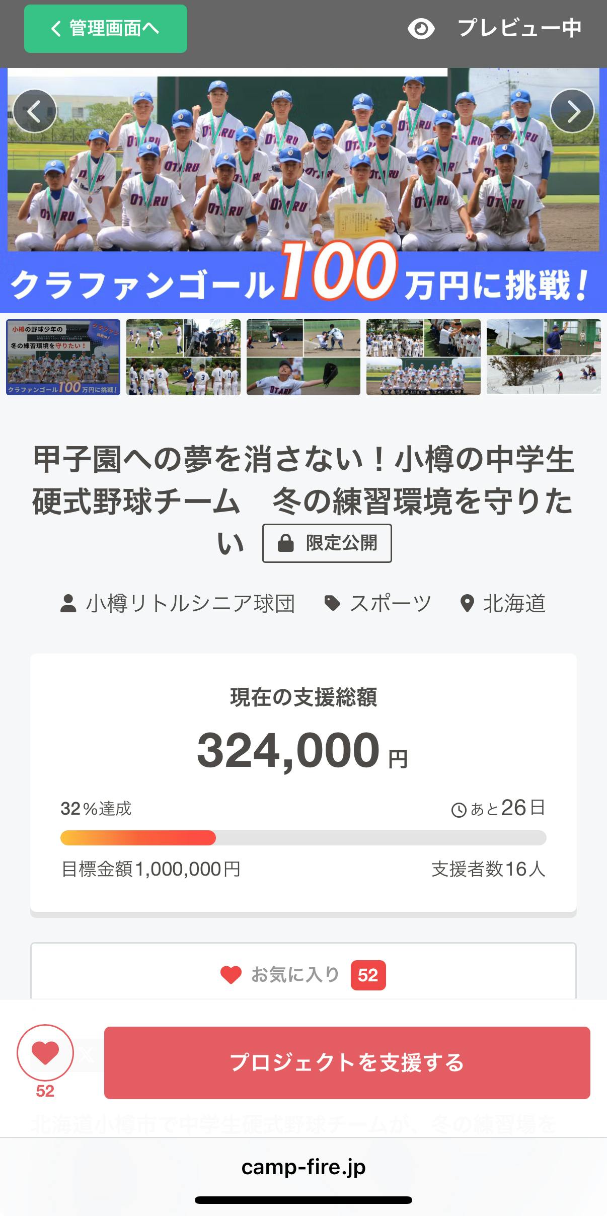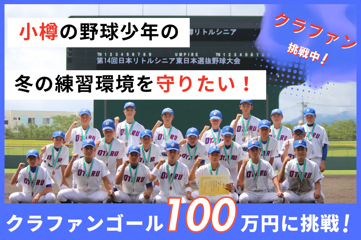2025/10/25 17:21【活動報告】応援いただいている皆さまへいつも温かいご支援・シェアをいただき、本当にありがとうございます。おかげさまで、クラウドファンディングの支援総額が 62万円(達成率62%) に到達しました。まずはここまで背中を押してくださった皆さまに、心より感謝申し上げます。本プロジェクトは、「冬の小樽でも、子どもたちが思い切り野球に打ち込める環境を守りたい」という想いで立ち上げました。雪が多く厳しい冬の小樽では、室内練習場の確保が子どもたちの成長に直結します。「野球を続けたい」「上手くなりたい」「夢を追いかけたい」そんな真っ直ぐな気持ちを、途切れさせたくありません。 クラウドファンディング終了まで、残り6日となりました。ここからがラストスパートです。もしまだご覧いただいていない方がいらっしゃいましたら、ぜひプロジェクトページを覗いていただけたら嬉しいです。ご無理のない範囲でのご支援や、シェアでの応援も、とても大きな力になります。最後まで温かく見守っていただけましたら幸いです。引き続きどうぞよろしくお願いいたします。先日卒団試合を行った時の様子です。 もっと見る