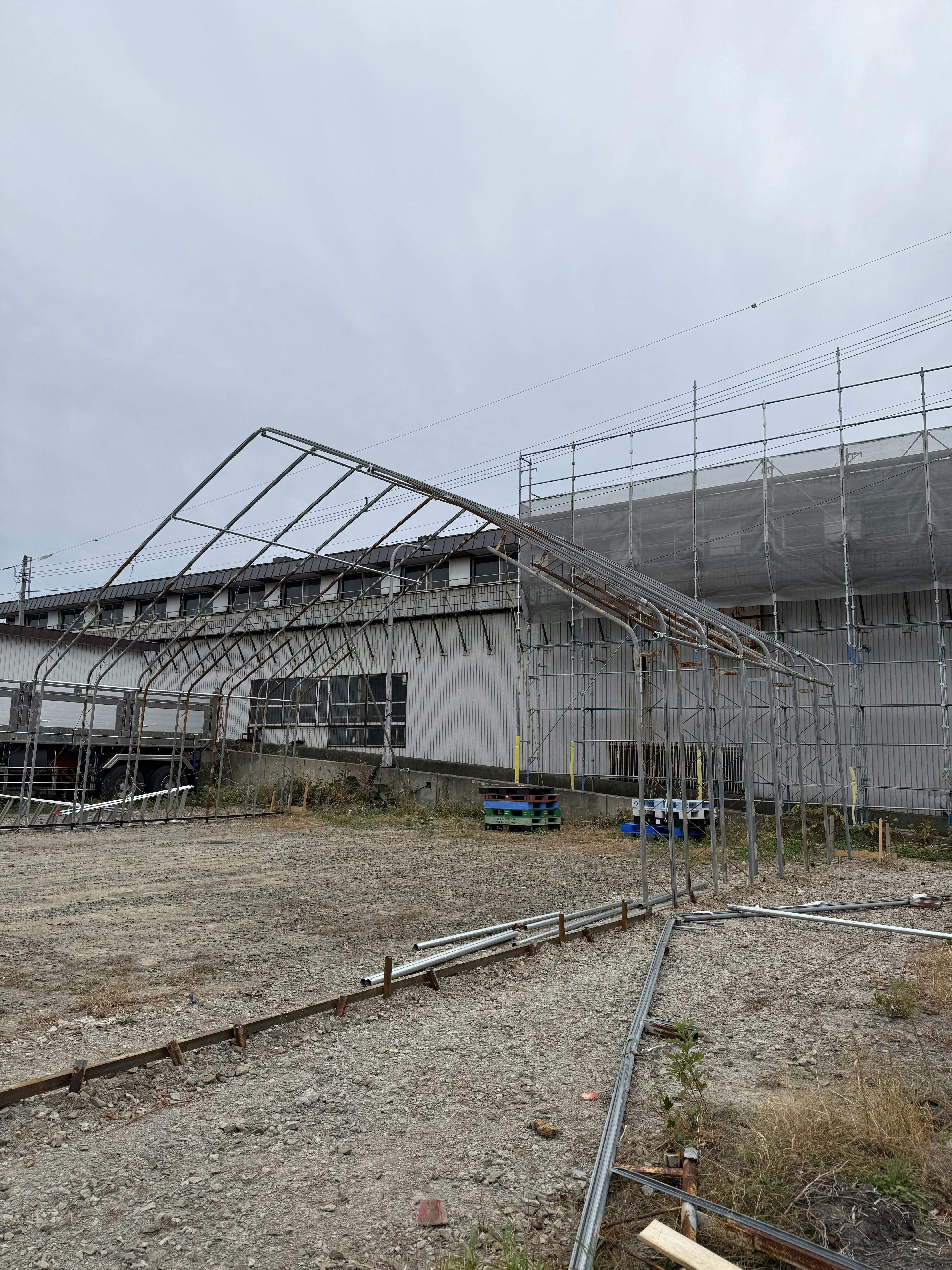 現在、鉄骨の組み上げやシート張りなどの作業が進められています。