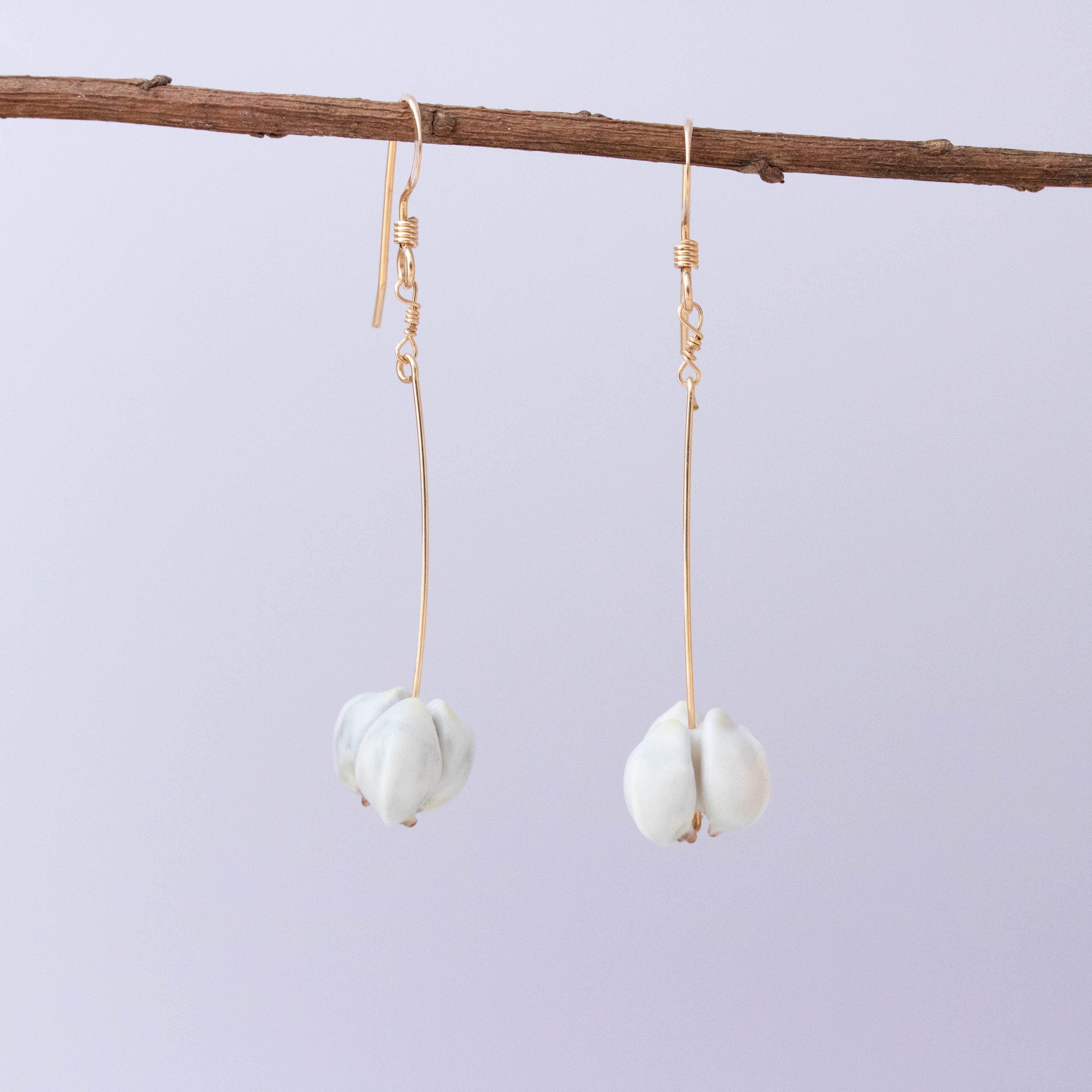 「hozuki」はグレーの彩色、または金のドットの2種類よりお選びいただけます。柔らかなグレーの彩色と華やかさもある金のドット。同じ形ですが付けた時の印象が色によって変わりそうですね。ぷっくりとした白い実がそのままピアスになったかのような「nankinhaze」も面白いデザインです。