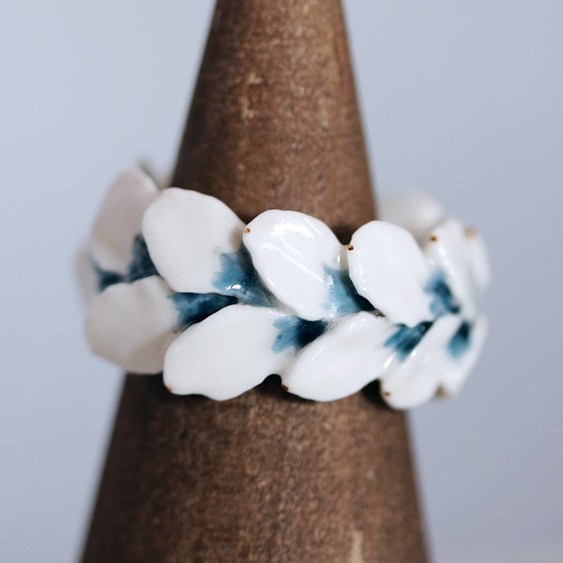 「ring leaves」は葉っぱが重なっているような繊細なデザイン。ブルーの彩色も特徴的です。こちらは貴金属でのリングサイズ(1号程度)より少し大きめでのオーダーがおすすめです。