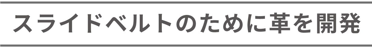 前回開発したAceオリジナルレザーを当初このスライドベルトでも使用を予定しておりました。しかし、度重なる試作・テストを重ねた結果、スライド式に使うには革が硬すぎてバックルに通しにくいという難点がありました。スライド式は1mm単位で微調整ができる機構なので、シリーズとして提案したいと考えていたため新たに「スライド用」のAceオリジナルレザーを開発することに決めました。