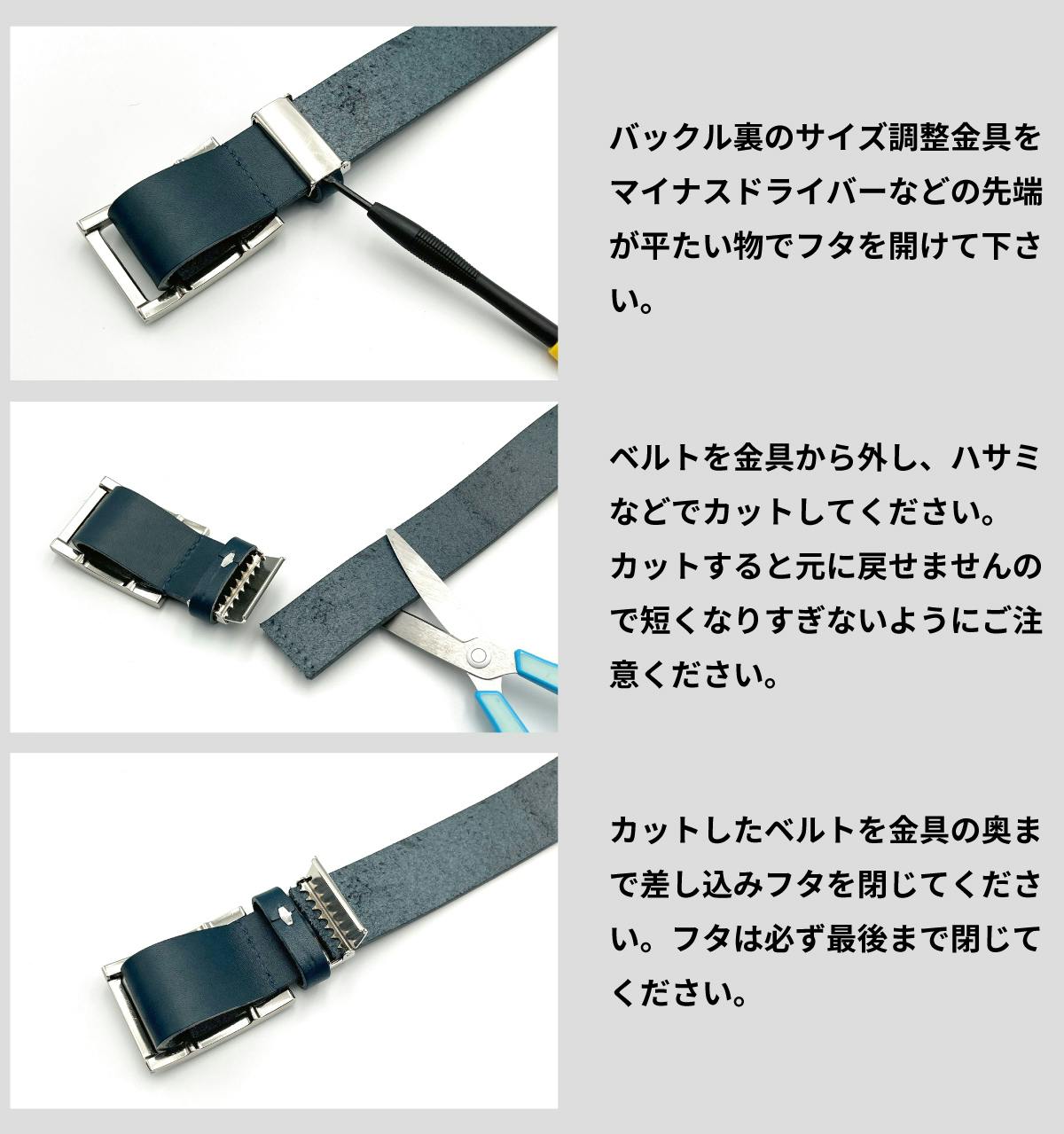 バックルメッキには「サテーナー」と呼ばれるスクラッチ加工が施されたシルバー色をご用意。スクラッチ加工により高級感が増し、なおかつ傷が目立ちにくいという利点もあります。毎日使うベルトだからこそ、傷が目立つことなくお使いいただけます。