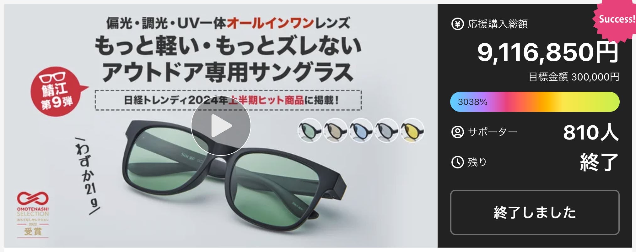 2026/02/10 11:30株式会社いちばんぼしの浅山佳映子です。いつも、Sorgeのプロジェクトを応援してくださり、本当にありがとうございます。このたび、Sorgeサングラスの新作プロジェクトをMakuakeにて公開する準備が整いました。★シリーズ最軽量となる 15g。今回のモデルは、これまでのシリーズを踏まえ、「かけていることを忘れる軽さ」をテーマに開発しています。長時間かけても負担を感じにくく、日常からアウトドアまで自然に使える一本を目指しました。★公開日時について2026年2月12日(木)11:30 公開予定▼プロジェクトページはこちらですhttps://www.makuake.com/project/sorge12/★CAMPFIRE支援者の皆さまへ(特典のご案内)これまで応援してくださった感謝の気持ちとして、公開日当日に使える500円OFFクーポンをご用意しました。公式LINEへご登録いただけますとお受け取りいただけます。▶︎Sorge公式LINE → https://lin.ee/vV7BC5e ※事前に取得しておくことで、公開当日にスムーズにご利用いただけます。ぜひ、事前にLINE登録をして、クーポンをGETしてくださいね。公開日が近づきましたら、また活動報告でお知らせいたします。これからも、Sorgeのものづくりを温かく見守っていただけたら嬉しいです。引き続きどうぞよろしくお願いいたします。株式会社いちばんぼし浅山佳映子 もっと見る