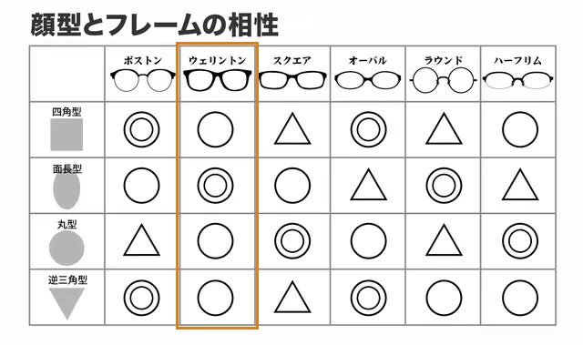 額が広めでアゴに向かって細くなる逆三角形型は、ウェリントンの上部のラインが広い額の印象をほどよくカバーします。下に向かって広がるデザインが顔の下半分にもボリューム感を与え、全体のバランスを整えてくれます。